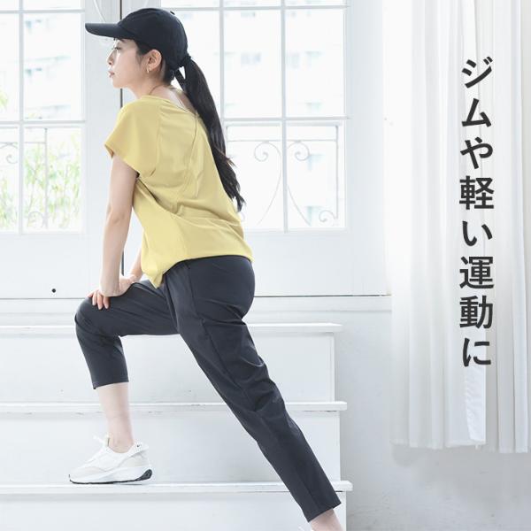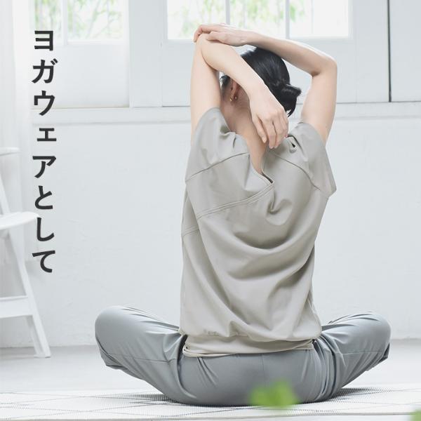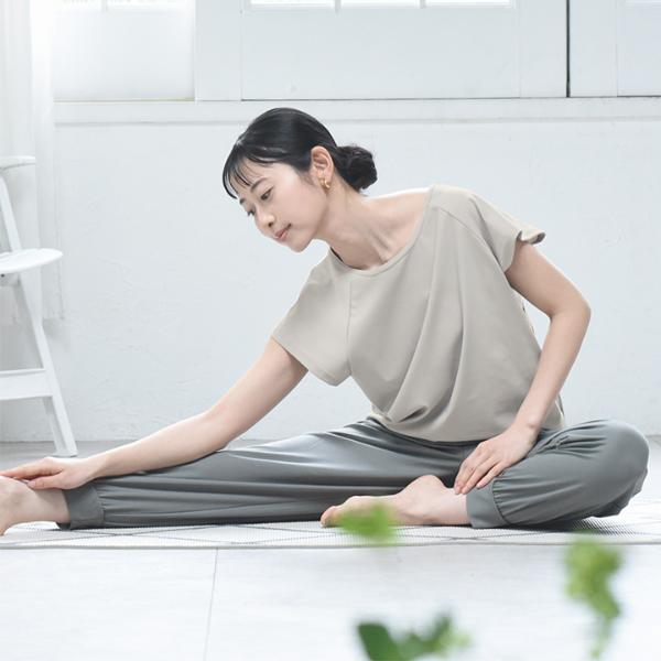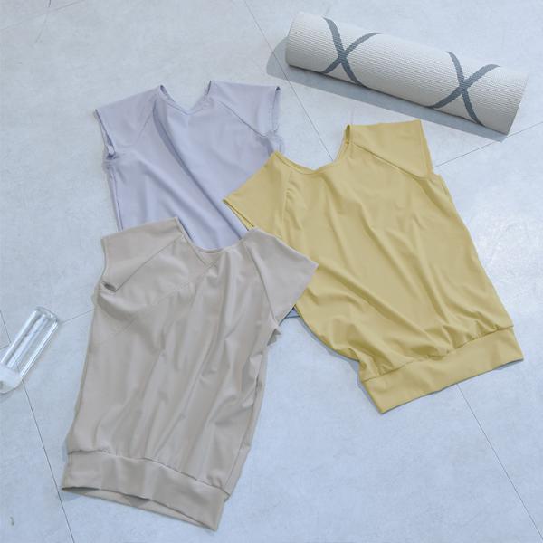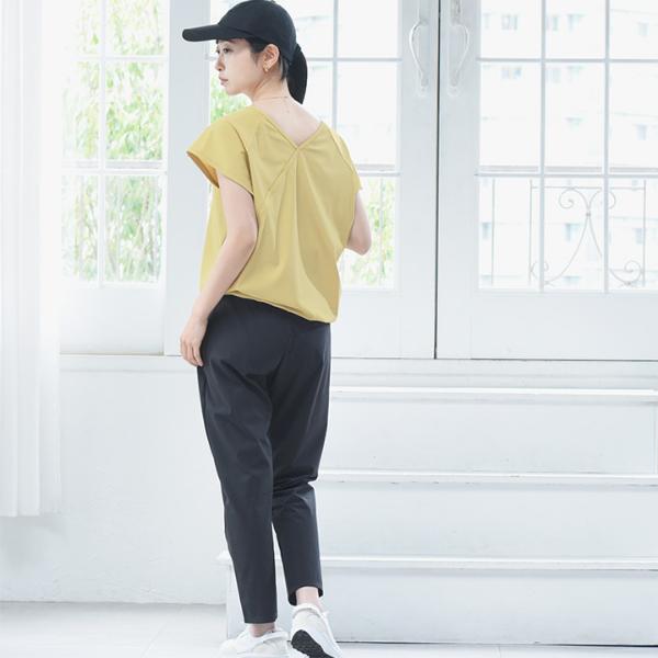 さらっとした肌触りで、汗をかくシーンでもベタつきにくく、ストレッチ性もばつぐん。シンプルながら、カシュクール風のバッグデザインがモチベを上げてくれます。