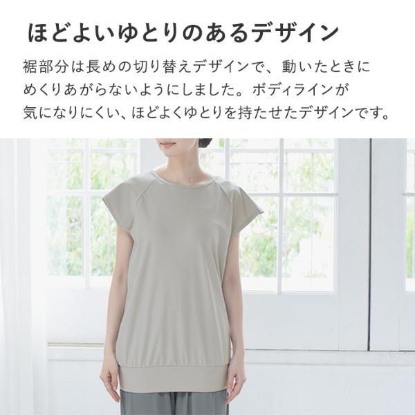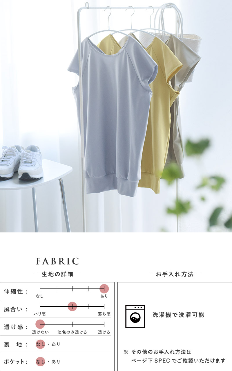 裾部分は長めの切り替えデザインで、動いたときにめくりあがらないようにしました。全体的にフィット感もありつつ、ボディラインが気になりにくい、ほどよくゆとりを持たせたデザインです。