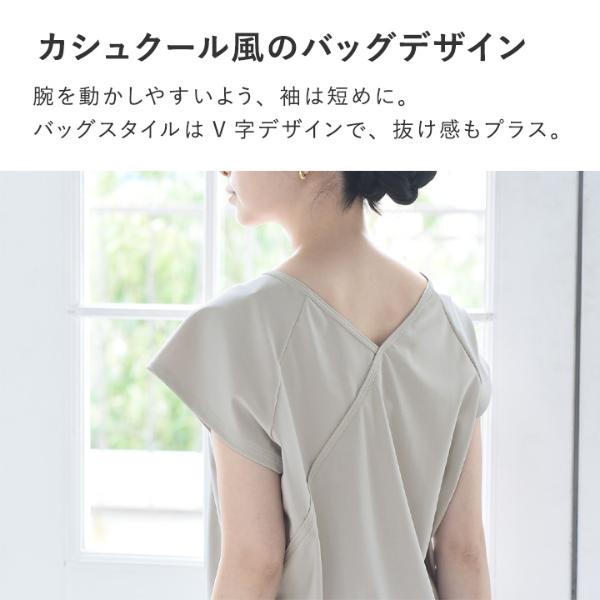 腕を動かしやすいよう、袖は短めに。バッグスタイルはV字デザインで、抜け感もプラス。