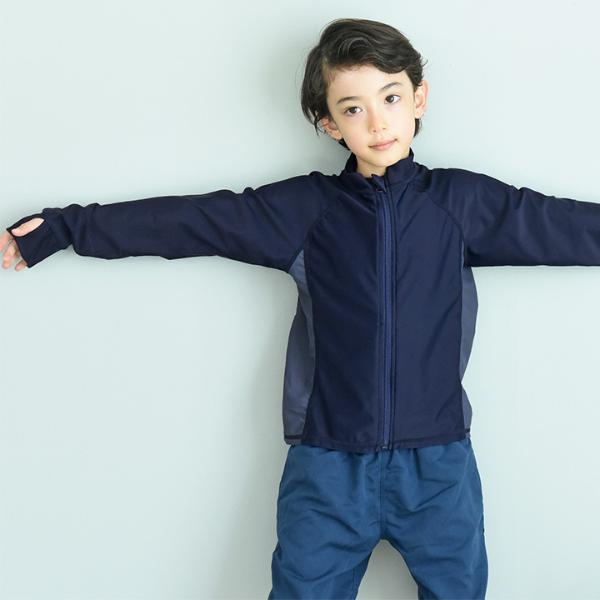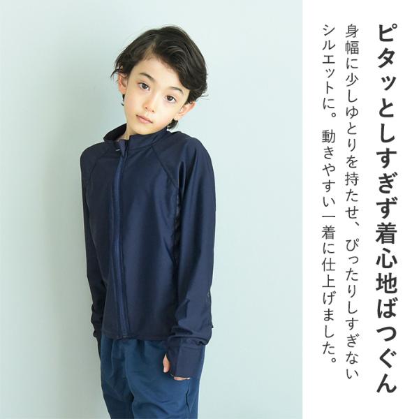 ぴったりしすぎず、ほどよくゆとりを持たせたキッズのUVラッシュガード。360度ぐーんと伸びるシルエットで、着心地も◎です。
