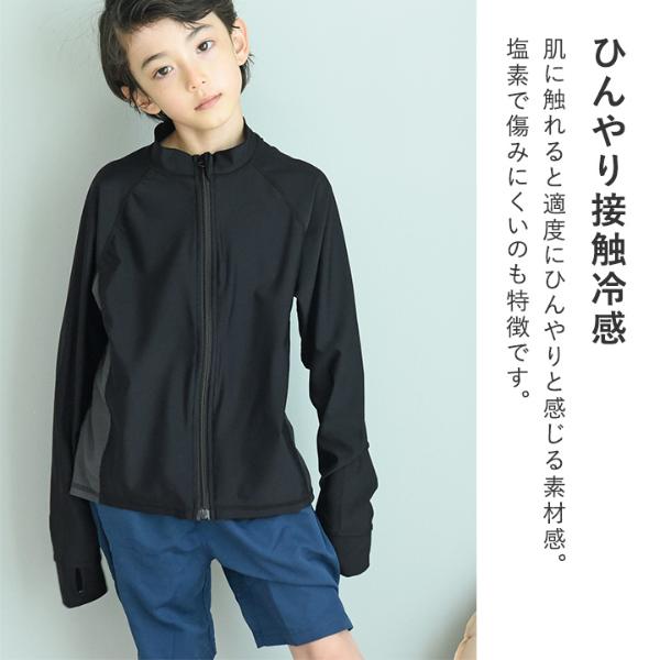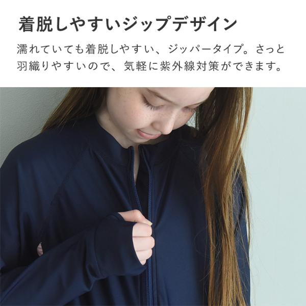 濡れていても脱ぎ着しやすい、ジッパータイプのフロントデザイン。さっと羽織りやすいので、気軽に紫外線対策ができます。
