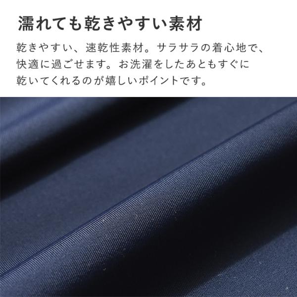 濡れたり、たくさん汗をかいたりしたときも乾きやすい、速乾性素材。サラサラの着心地で、快適に過ごせます。お洗濯をしたあともすぐに乾いてくれるのが嬉しいポイントです。