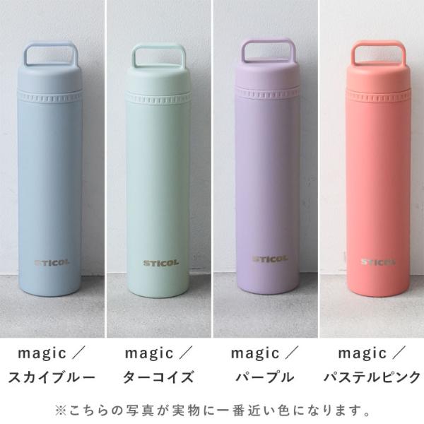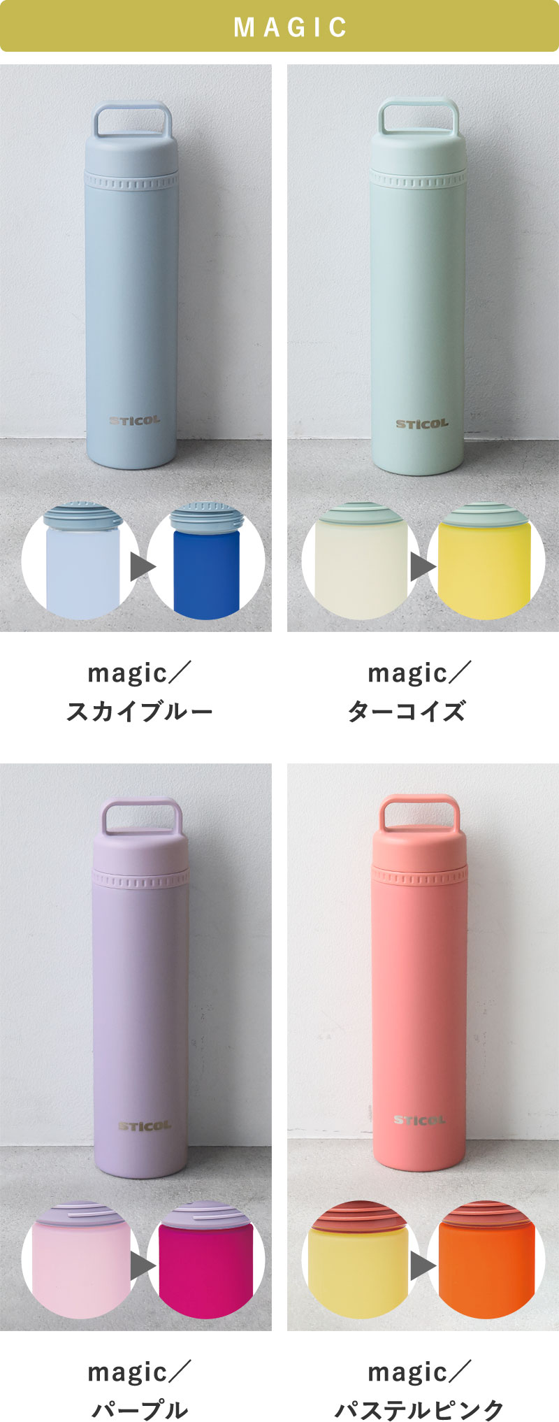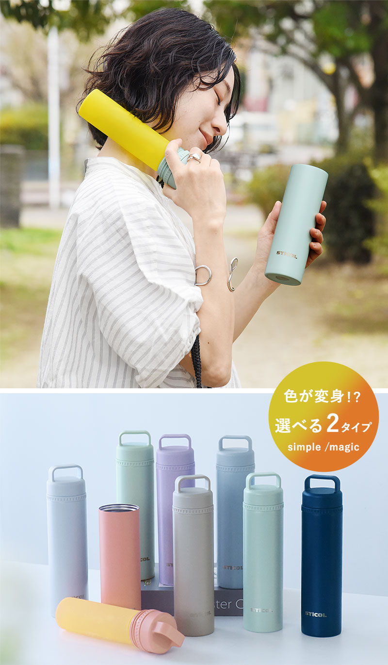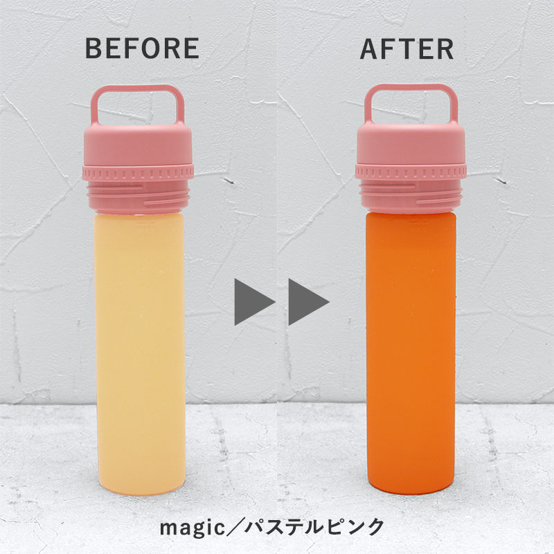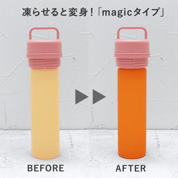 シリコンボトルは通常タイプとmagicタイプの2種類。magicタイプは凍らせると鮮やかなカラーに変身します。