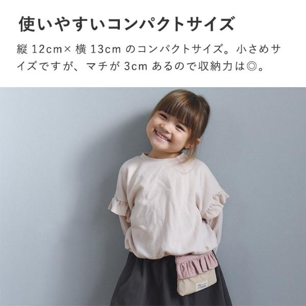 使いやすいコンパクトサイズ縦12cm×横13cmと、幅広い年齢のキッズが着用しやすいコンパクトサイズに。小さ目サイズですが、マチが3cmあるので収納力は◎。替えのマスクや絆創膏など、すぐ取り出す必要はないけれど持ち歩きたい、そんなアイテムも入れておけます。