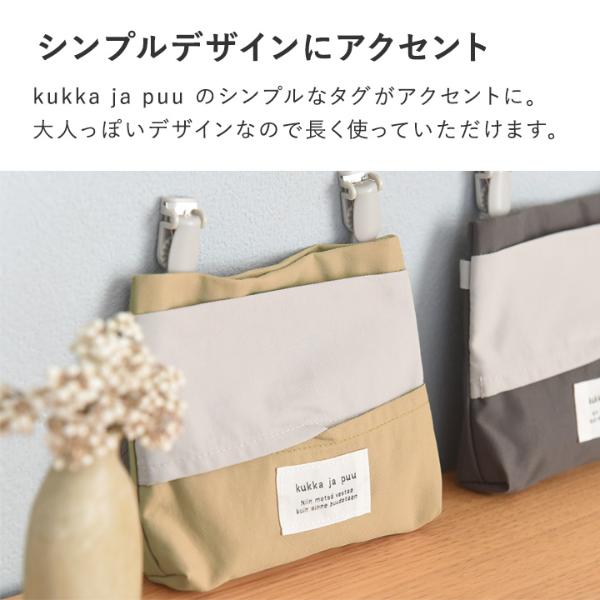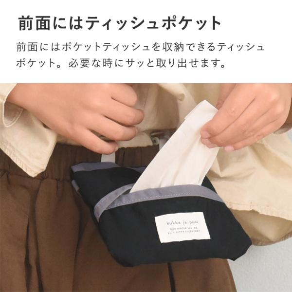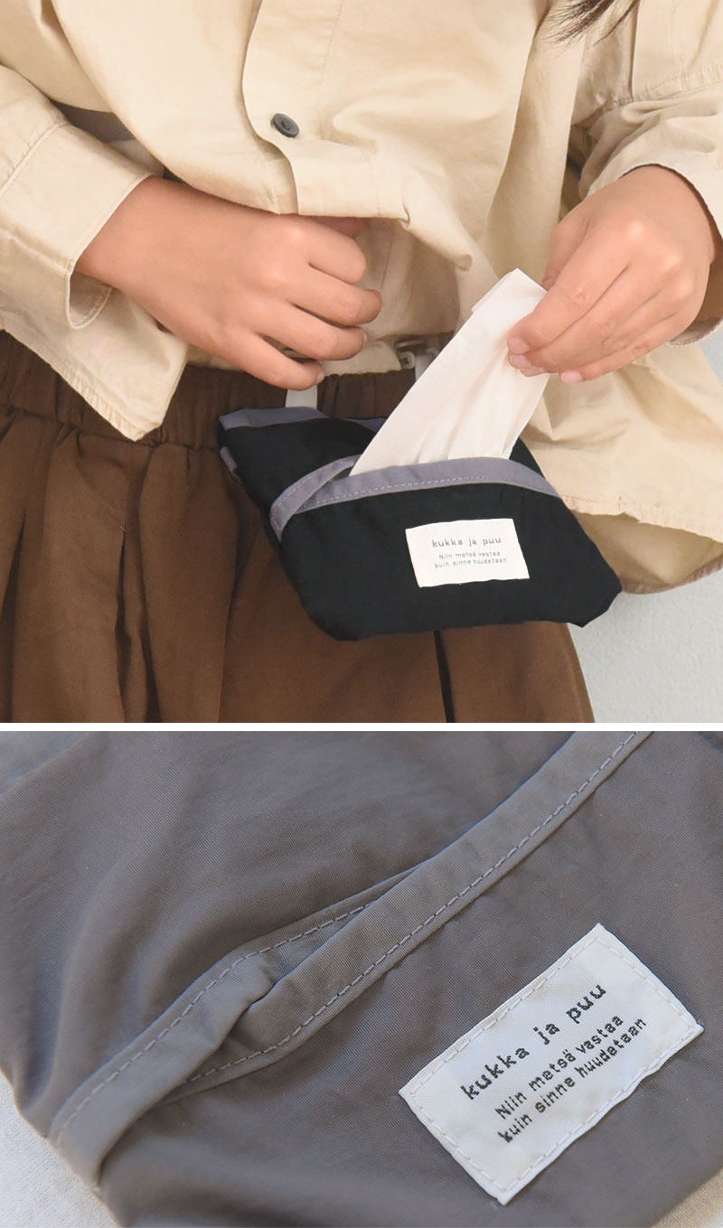 kukka ja puu(クッカヤプー)の「マスク・ティッシュケース」は、幅広い年齢のキッズが持ちやすい、コンパクトなサイズ感。前面はティッシュケースになっていて、メインポケットには畳んだマスクやハンカチを入れておけます。