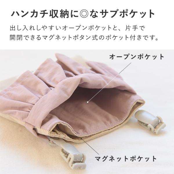 ハンカチ収納に◎なサブポケットティッシュポケットの後ろにはサブポケットが2つ付いています。出し入れしやすいオープンポケットと片手で開閉できるマグネットボタン式のポケットが付いているから小さく見えて収納もバッチリ。