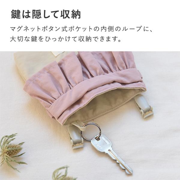 鍵は隠して収納マグネットボタン式ポケットの内側にはループが付いているので、大切な鍵をひっかけておくのにお使いいただけます。