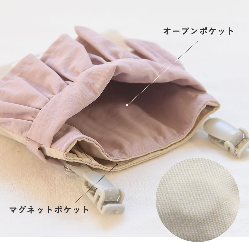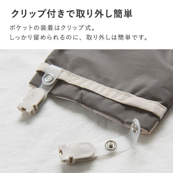 クリップ付きで取り外し簡単ポケットの装着はクリップ式。しっかり留められるのに、取り外しは簡単です。