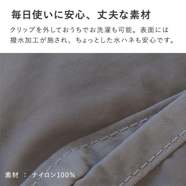 クリップを外しておうちでお洗濯も可能。表面に撥水加工が施されているので、ちょっとした水ハネも安心です。