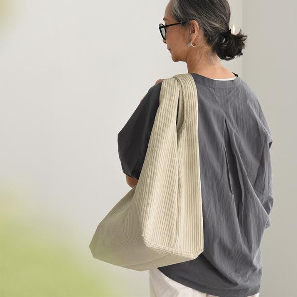 肩掛けしやすいカタチたくさん買い物をしても肩掛けしやすいように、腕を通す部分は広くて丸いカタチに。コートなどで厚着していても腕を通しやすい設計です。