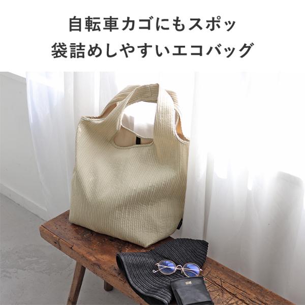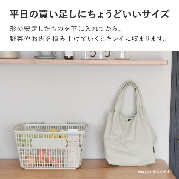 - スーパーでのお買い物に、ちょうどいいエコバッグ。レジかご1杯分くらいの食品を入れるのにおすすめ。マチが広いので中のものが安定しやすく、自転車の前かごに入れやすいのも◎