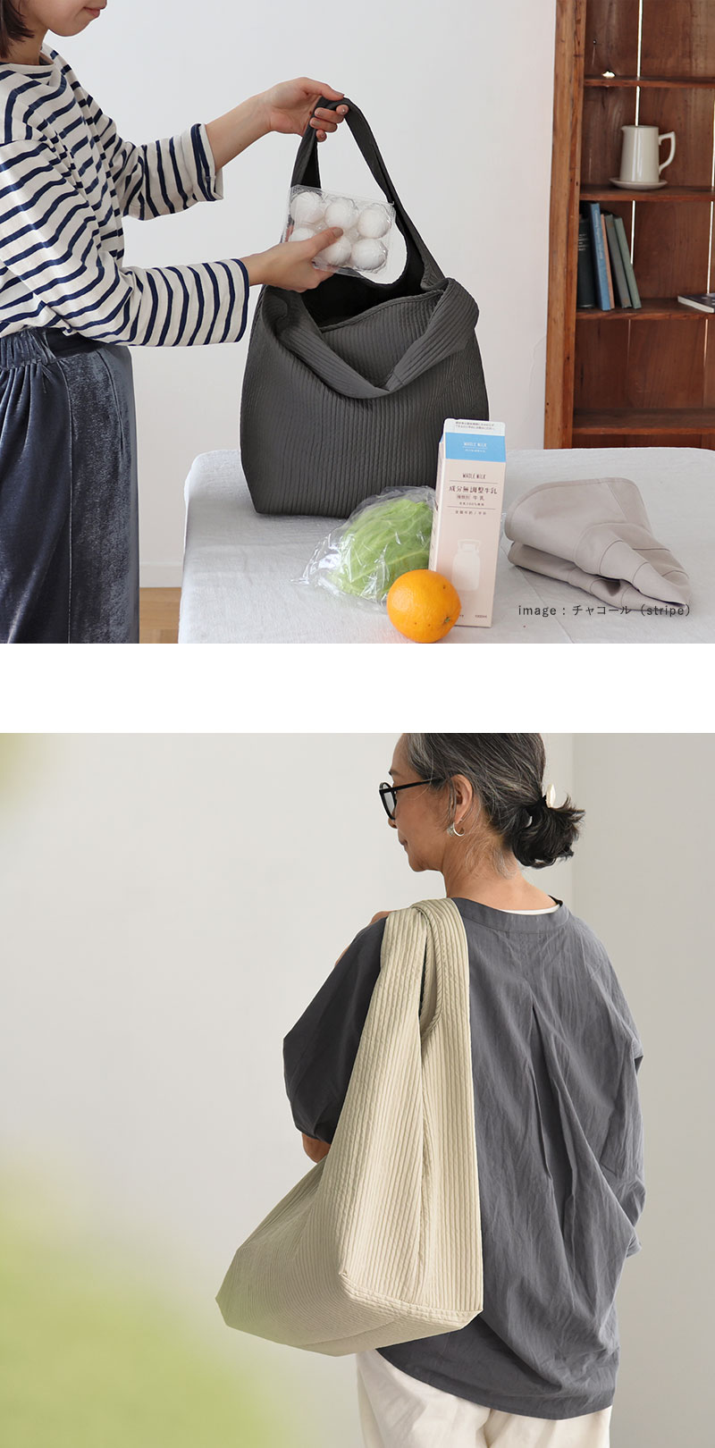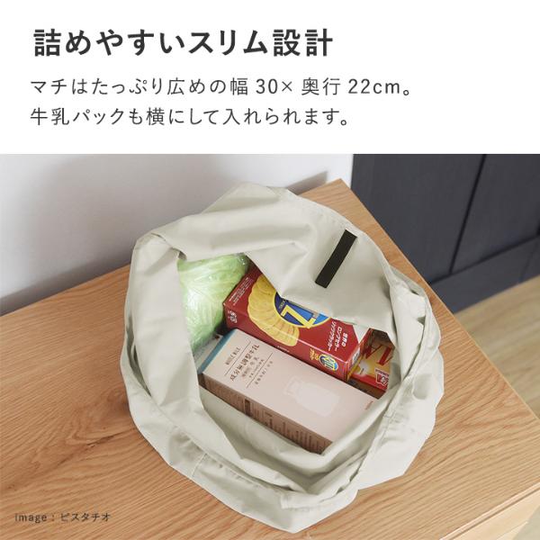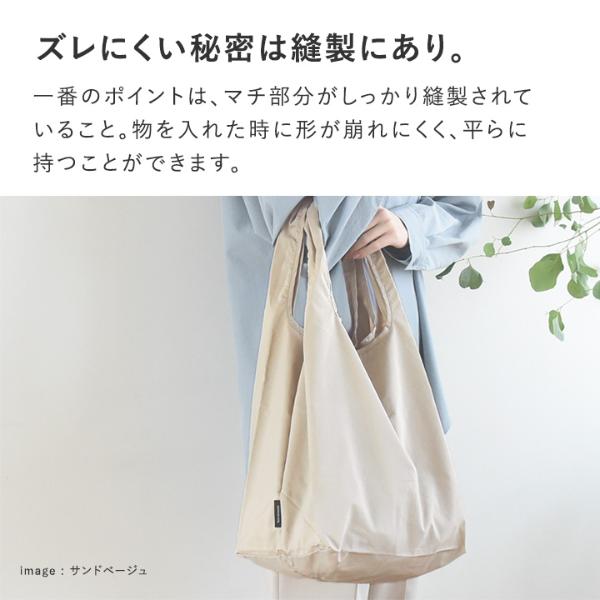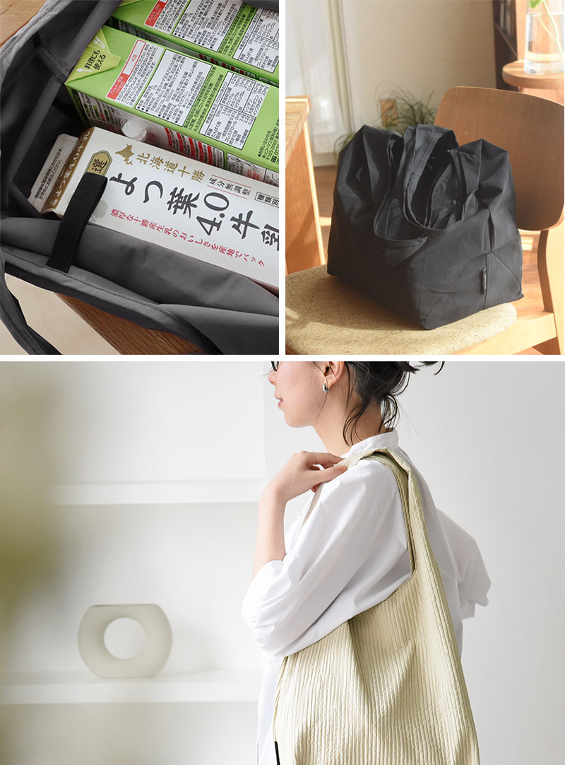予め縫製された広めのマチは、形が崩れにくく、中に詰めた食材が安定。程よくスリムな形で、エコバッグの中で雪崩が起きにくくなっています。パズルのようにキレイに食材を入れることができるので、スーパーでの袋詰めが楽しくなりそう。