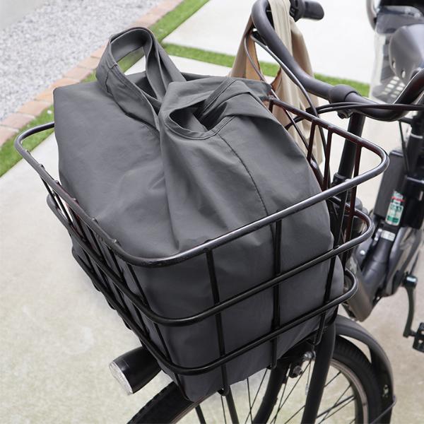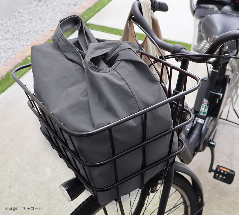 自転車のカゴにスッポリ入るサイズ感なのも嬉しい特徴。ありそうでなかった、理想のカタチのエコバッグです。