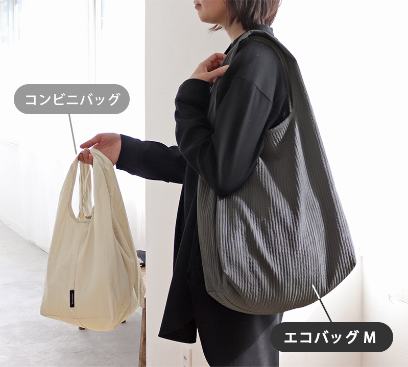 たっぷり買う日は、サイズ違いで2つ使いこちらのシリーズは全3サイズ展開。買い物の量が多い日は、こちらのコンビニバッグと合わせてワンサイズ大きい「エコバッグM」を使えば、ちょうどよく収まります。