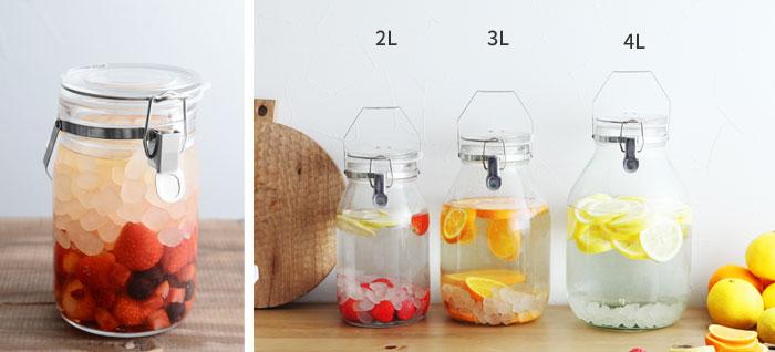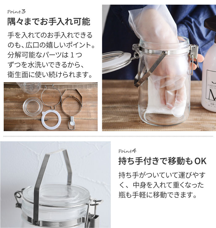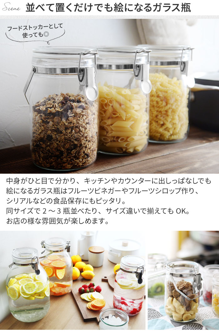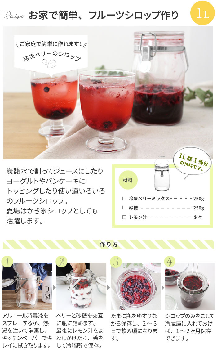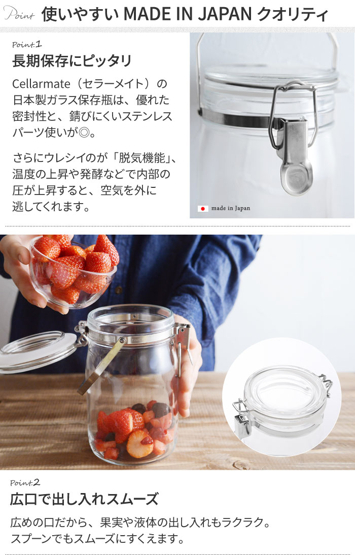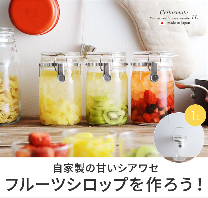 - 梅酒や梅シロップ、フルーツシロップづくりに役立つ1Lの瓶の保存容器。広口で脱気機能付き、金具は全てステンレスで、錆びにくいのも嬉しいポイントです。
