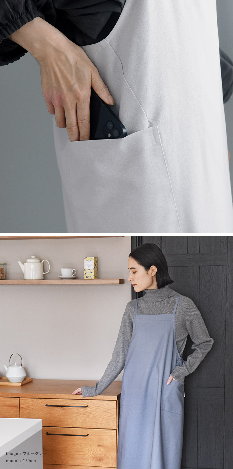 肩紐は後ろのボタンで3段階で調節でき、低身長の方でもバランス良く着こなせるのもポイント。毎日使いに丁度いいこんなエプロンを、優しい風合いの素材で作りました。