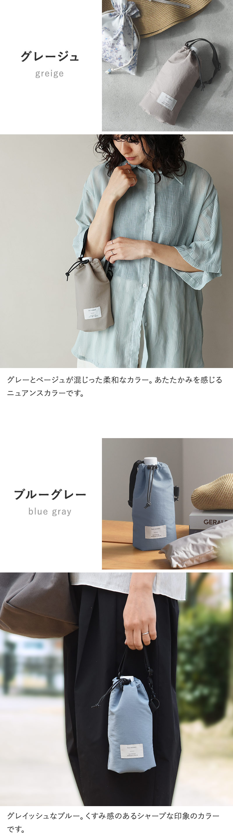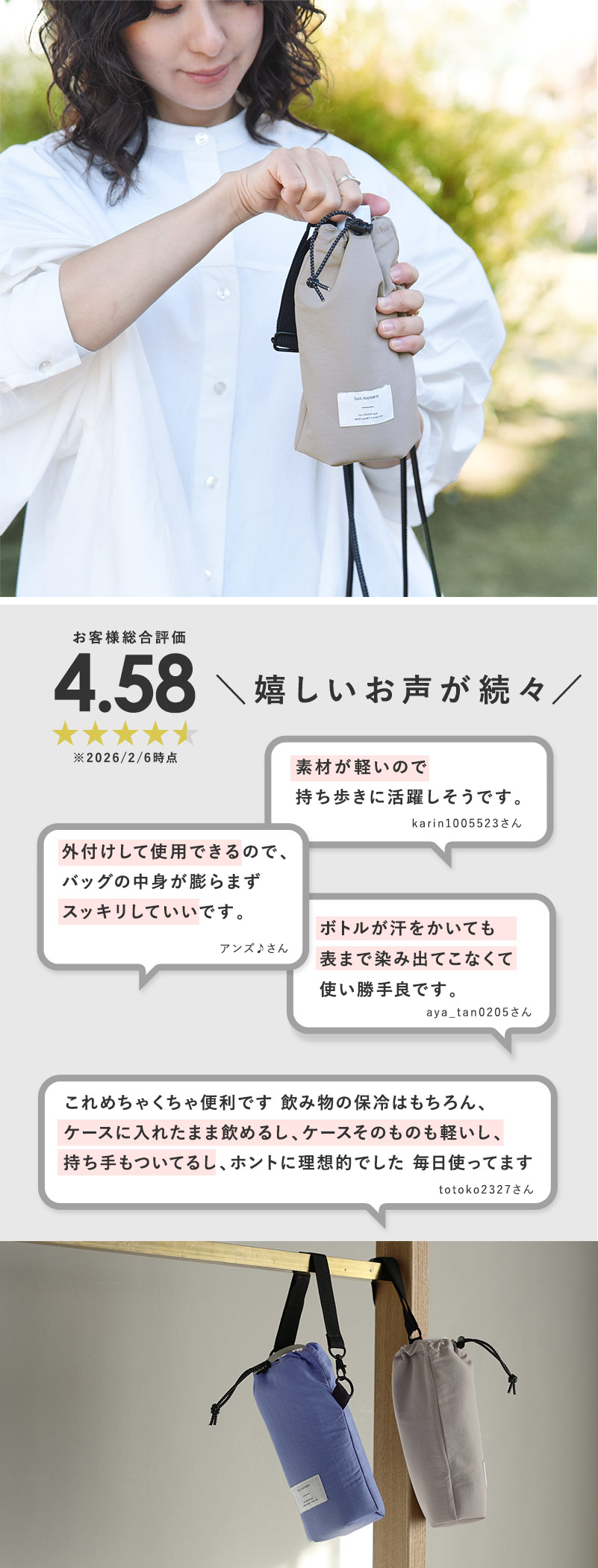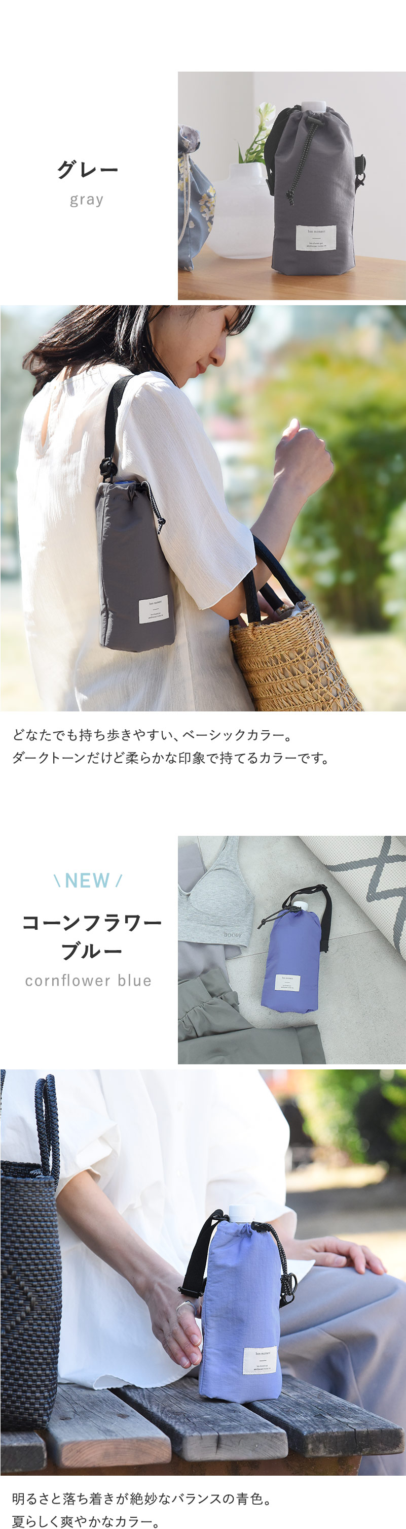 カバンに取り付けられるショルダー付きペットボトルが入らないミニバッグでのお出かけの時もコレなら。長さが調整できる持ち手付きなので、バッグの持ち手に引っ掛けて持ち歩くこともできます。