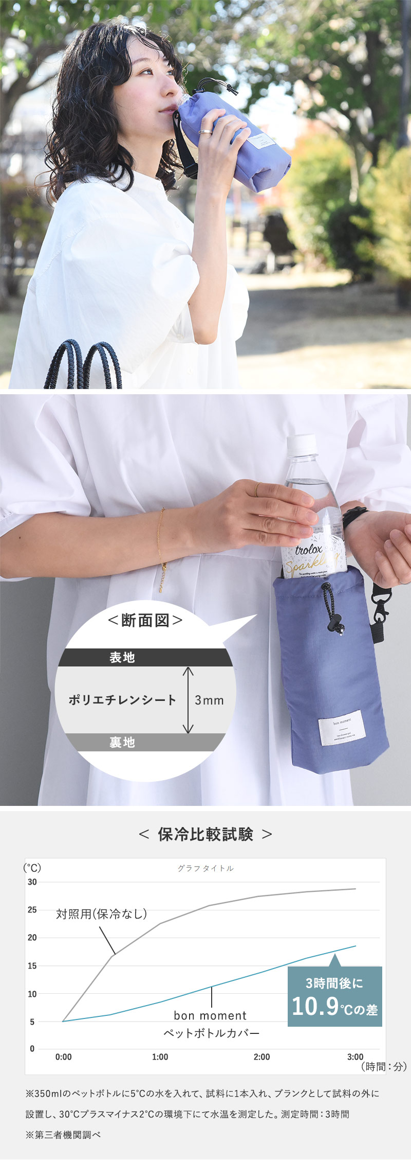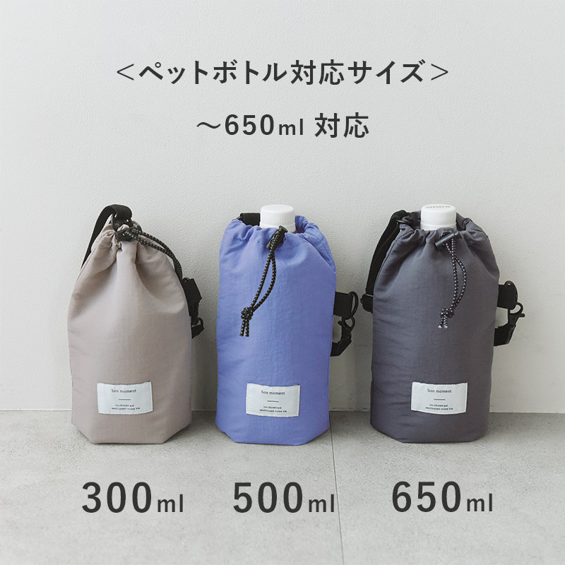 そんな時に頼れるのが、bon momentから誕生したペットボトルカバーです。水滴を防ぐのはもちろんのこと、3mm厚の保冷シートが入っていることで、暑い夏でもヒンヤリをキープ。