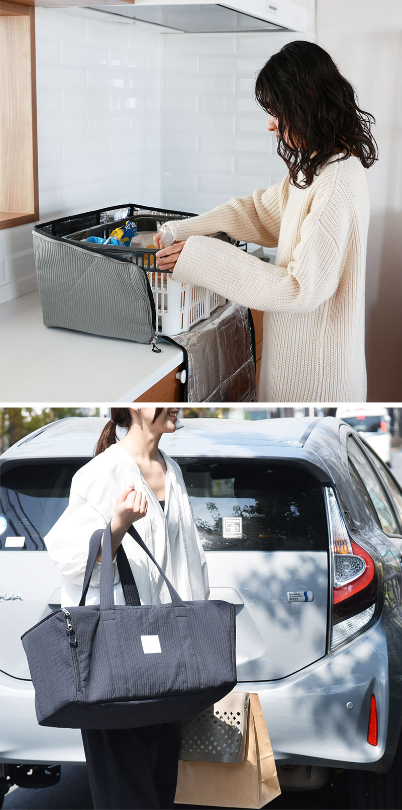 カゴごと保冷バッグに入れられるので、車に戻って別の保冷バッグへ詰め替えたりする手間はナシ。お家の冷蔵庫に運ぶまでひんやりをキープできるので、帰り道が渋滞していたり、途中で寄り道しても安心です。