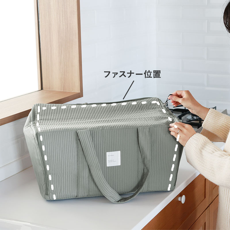 全面ファスナー仕様で冷気が逃げにくいマジックテープやマグネットで留めるタイプよりも密閉性が高い、全面ファスナー仕様。カゴのハンドルも、カゴ全体をすっぽり覆えるので冷気が逃げるのを防ぎます。