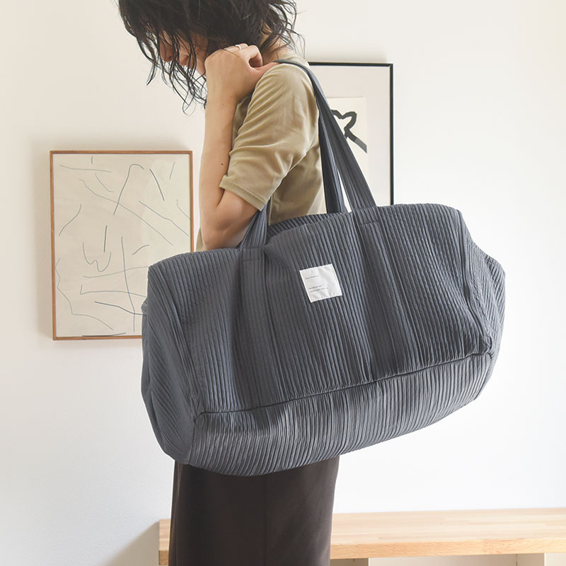 表面感のあるストライプ生地に白いタグをつけたシンプルさ。家族で持てるユニセックスなデザインです。