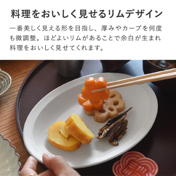 料理をおいしく見せるリムデザイン一番美しく見える形を目指し、厚みやカーブを何度も微調整したことで生まれたオーバル型。ほどよいリムがあることで余白が生まれ料理をおいしく見せてくれます。