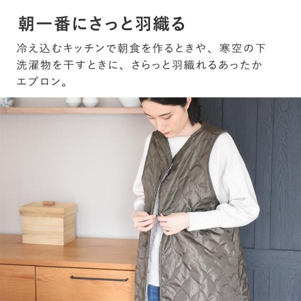 冷え込むキッチンで朝食を作るときや、寒空の下洗濯物を干すときに、さらっと羽織れるあったかエプロン。