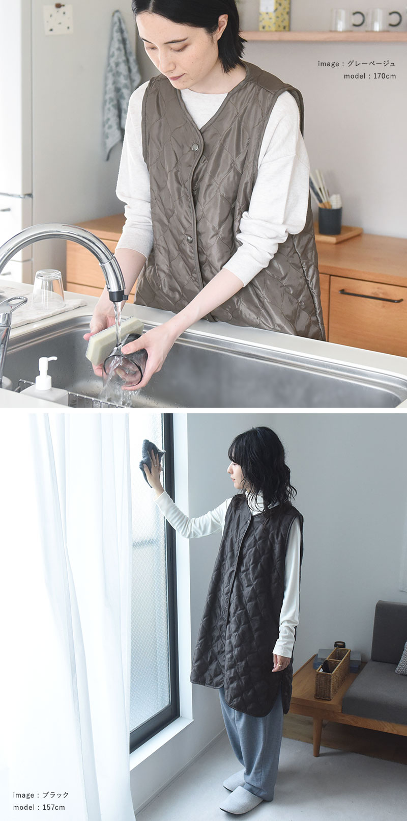 こちらは、重さ約320gで着心地軽やか。軽くてあたたかいので、家事の最中だけでなく、一日中着たまま過ごしていただけます