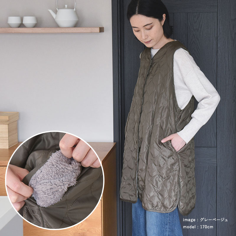 中綿入りのキルティング生地や裏側のふんわりボアであたたかく。表生地には撥水加工が施されているので、お皿洗いやお風呂掃除の時も安心です。