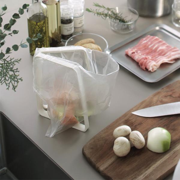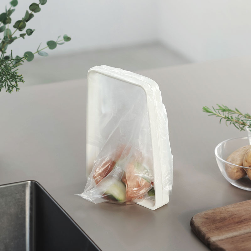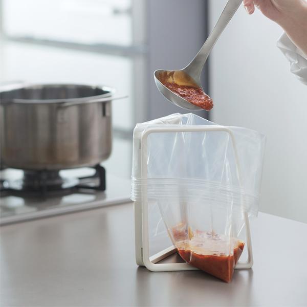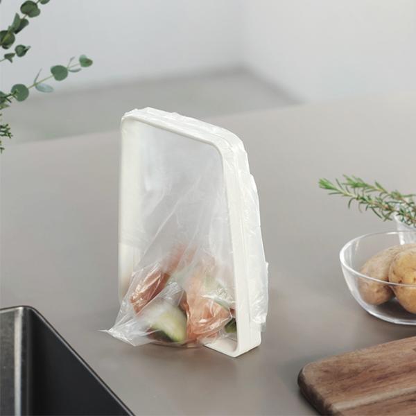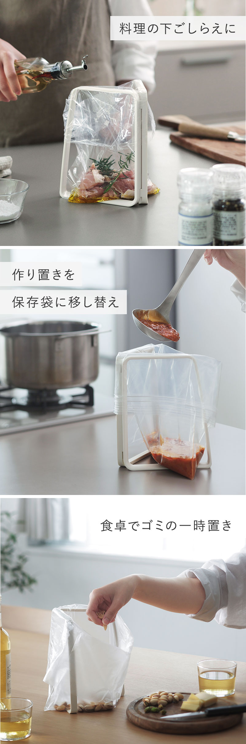 手前に大きく袋を開くことができるV字形状のポリ袋ホルダー。ゴミをサッと捨てやすく、お料理効率がアップします。開く角度を自由に調節できるので、コンパクトに使うことも◎