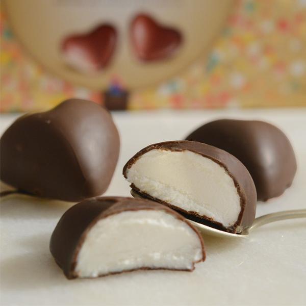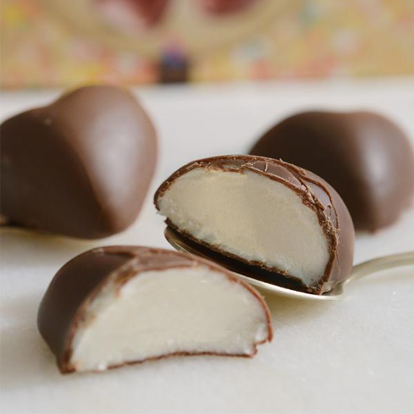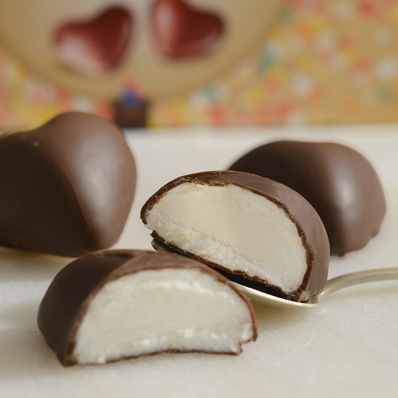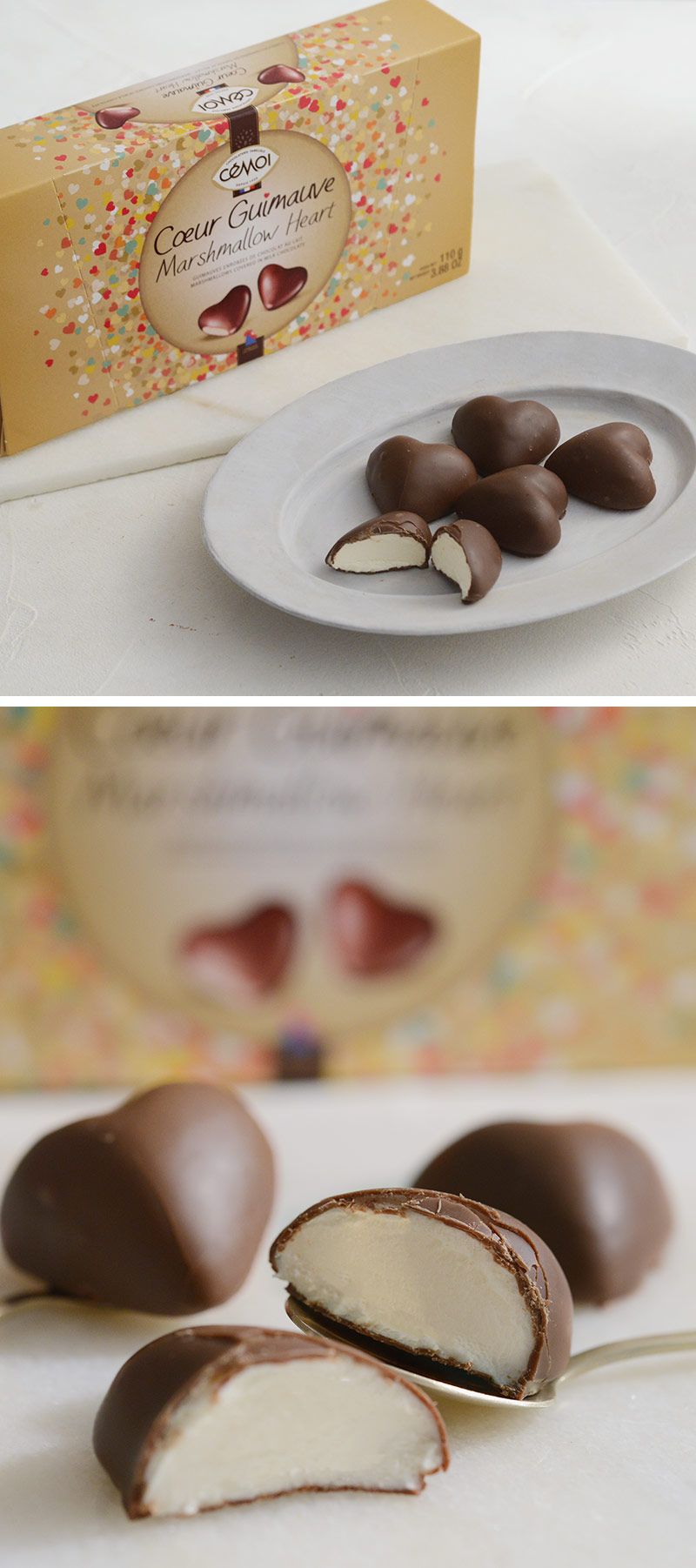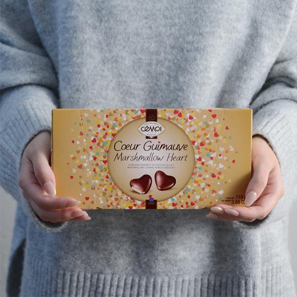- フランスで200年以上も受け継がれる伝統のレシピをもとに作られたマシュマロチョコ。もっちりとしたマシュマロを、ほどよい甘さのミルクチョコレートで薄く包み込んでいます。