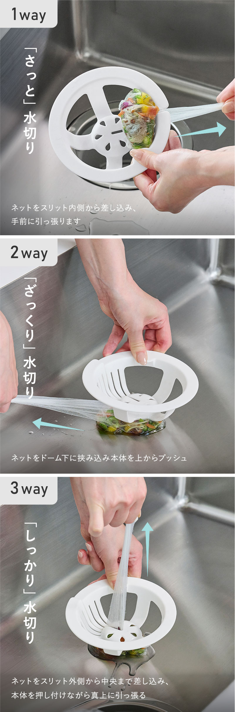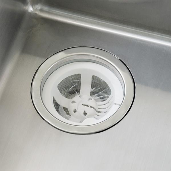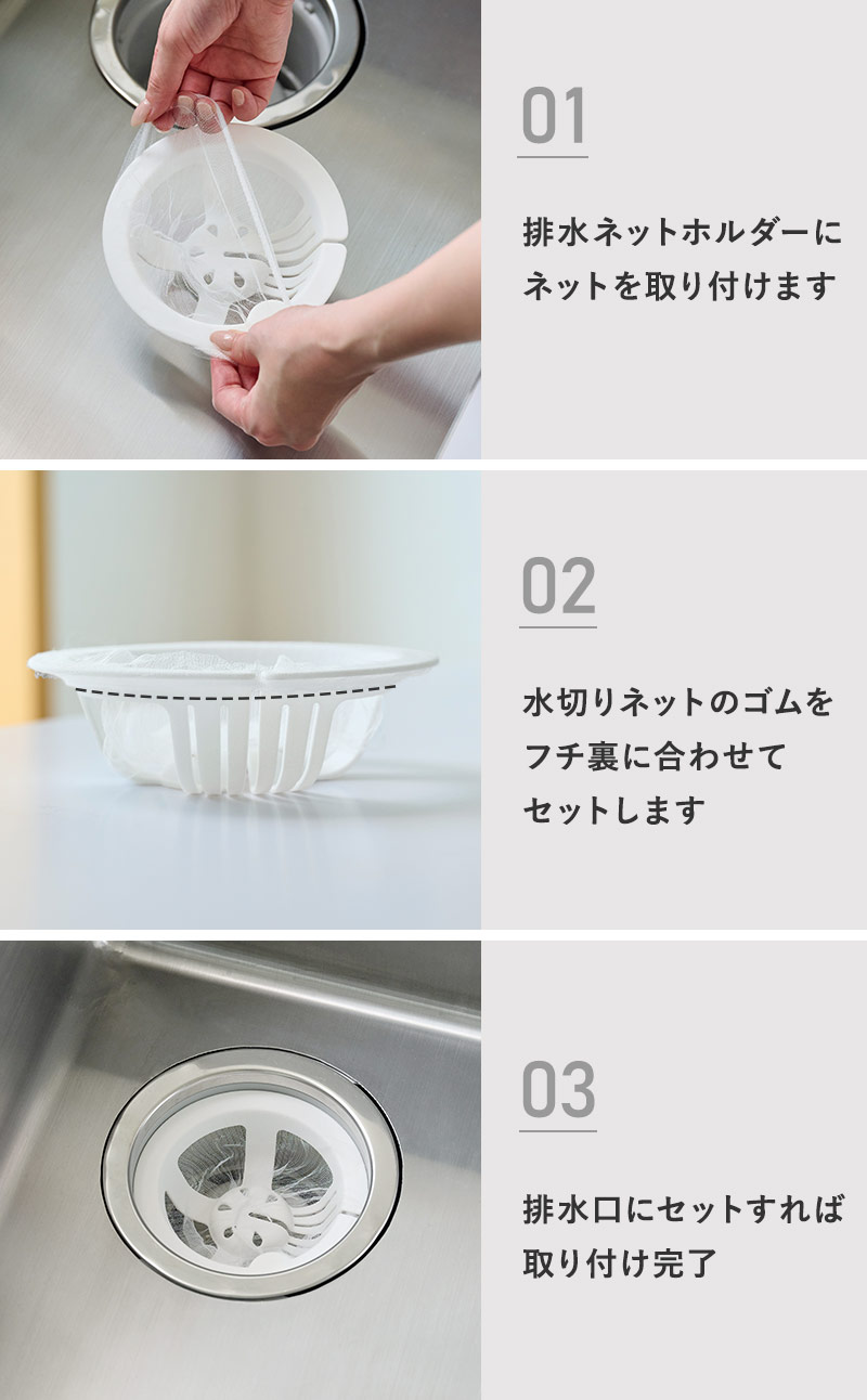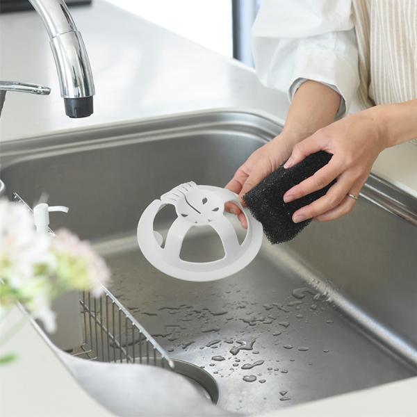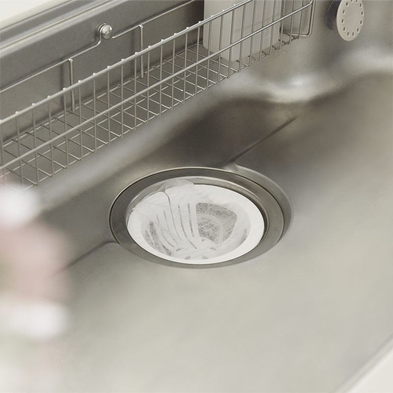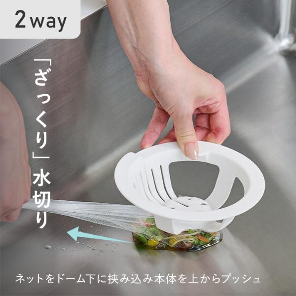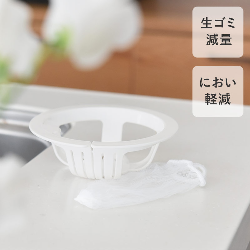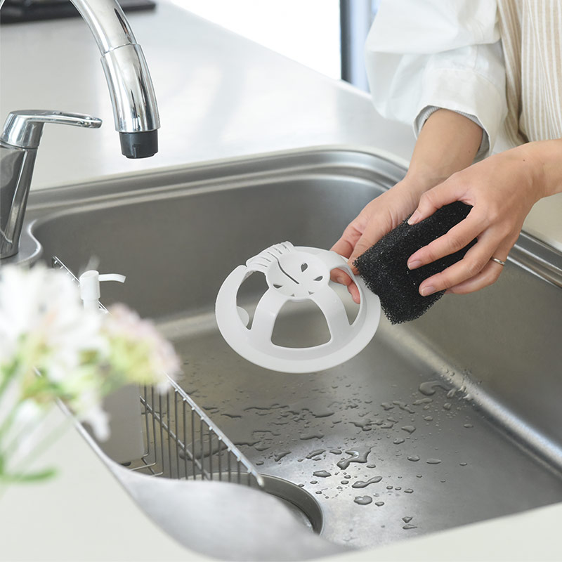 - スリットが入った技ありデザインの排水口ネットホルダー。ネットを通してグッと引っ張るだけ。直接生ごみに触れることなく水をきっちり絞れて、そのままポイっと捨てられます。