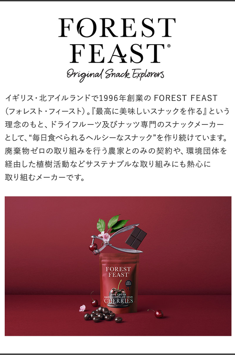 イギリスで1996年に創業した「フォレストファースト」が作るこちらは、世界中から厳選したドライフルーツにカカオ60%のダークチョコレートをコーティングした一品。