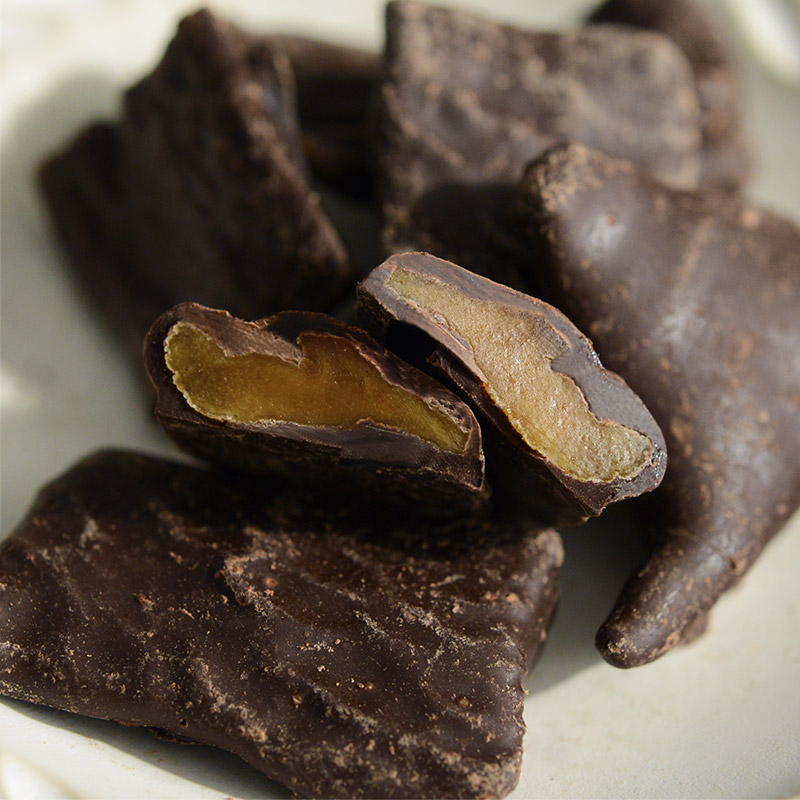 何層にもわたって丁寧にコーティングする伝統的な技法で作られたこちらは、ダークチョコレートの甘みやほろ苦さ、そしてフルーツの甘酸っぱさを同時に味わえる贅沢な一粒です。