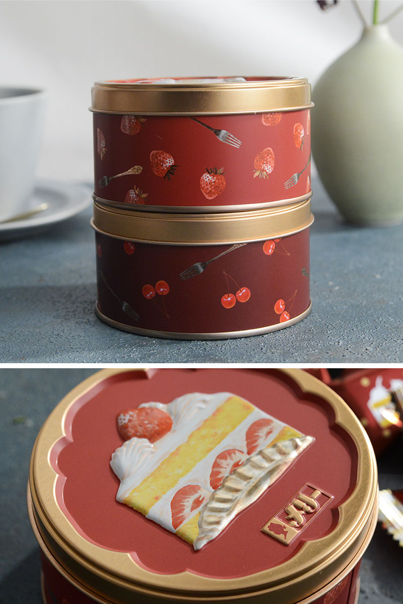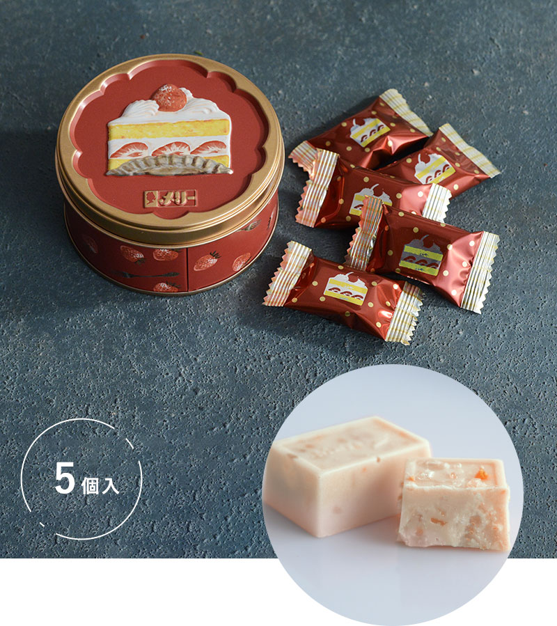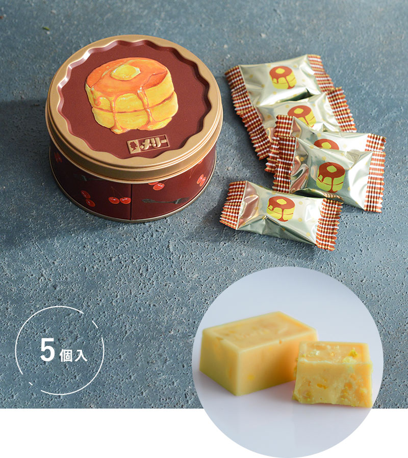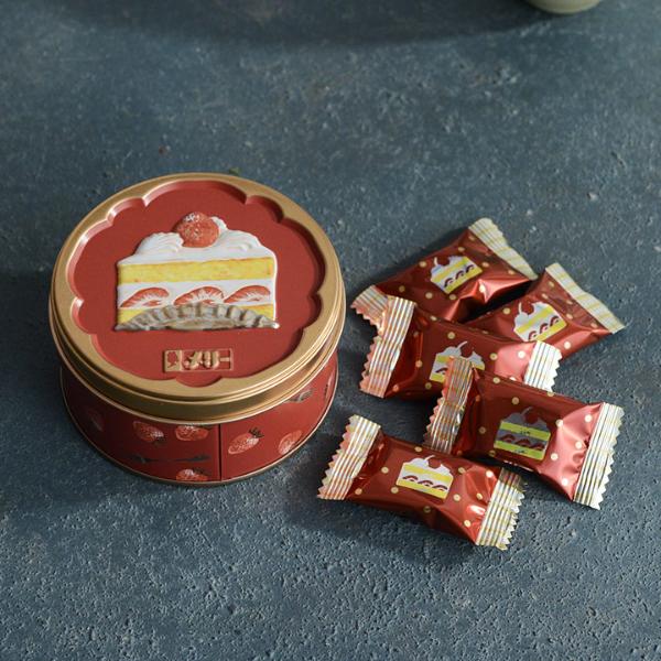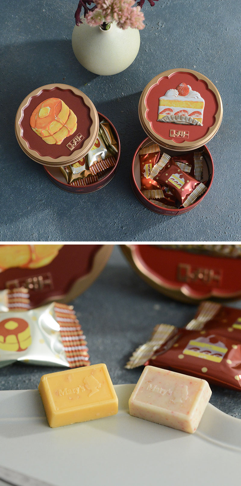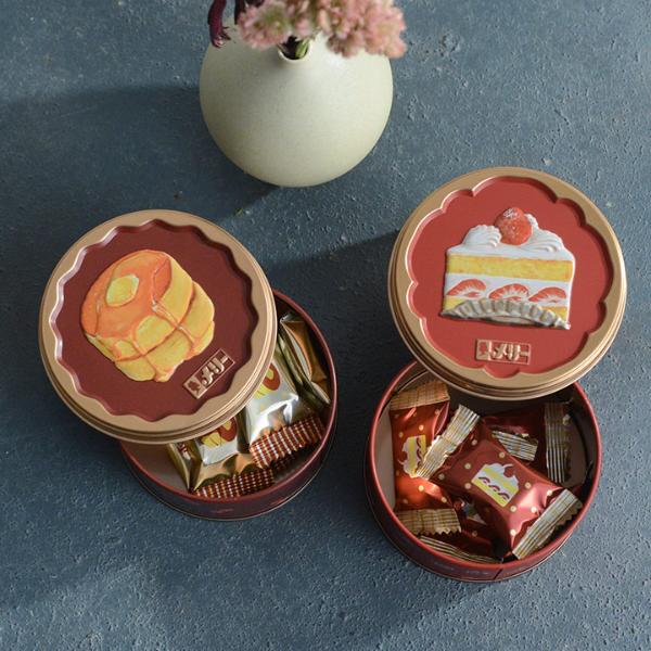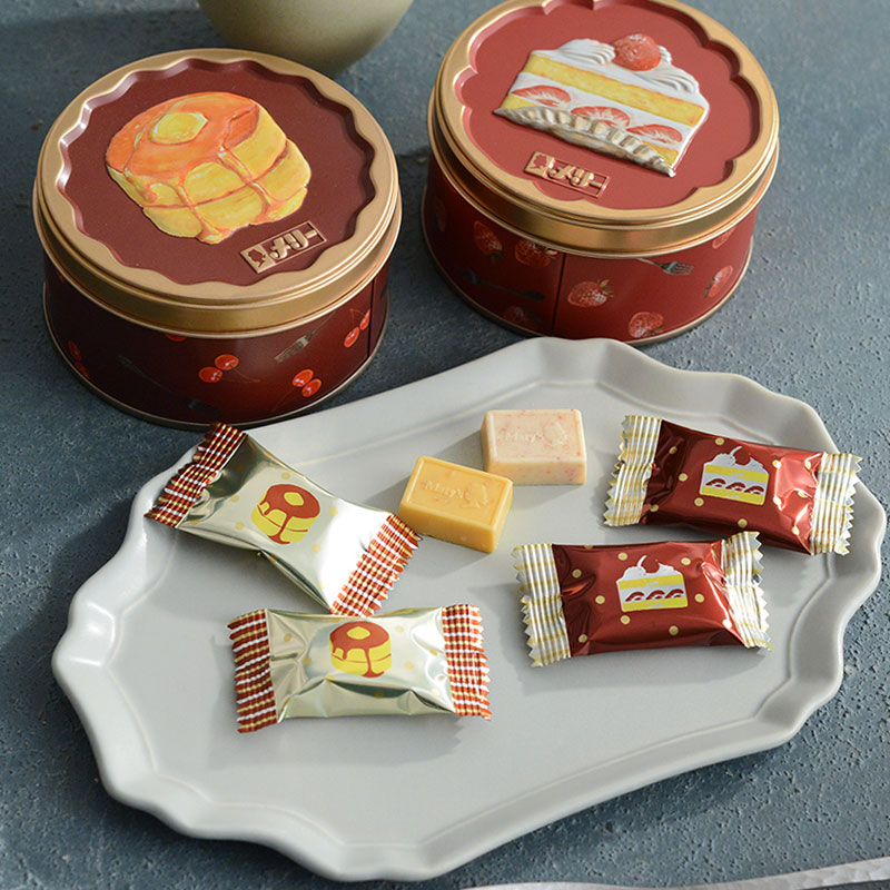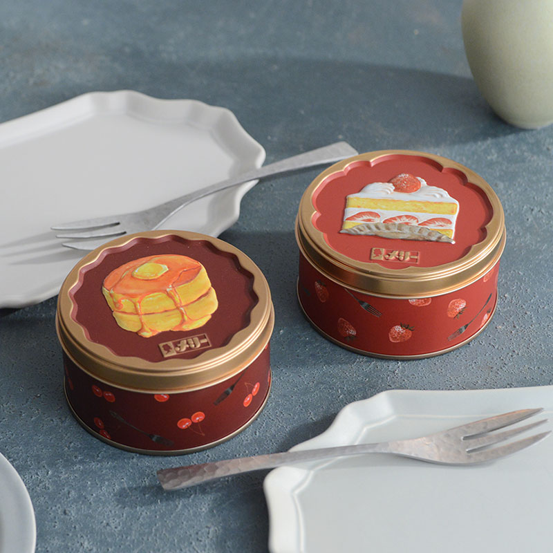 - レトロな文具を手掛ける古川紙工とコラボした「はじけるキャンディチョコレート」。こちらは、喫茶店の定番スイーツであるショートケーキ&ホットケーキ2缶セットです。