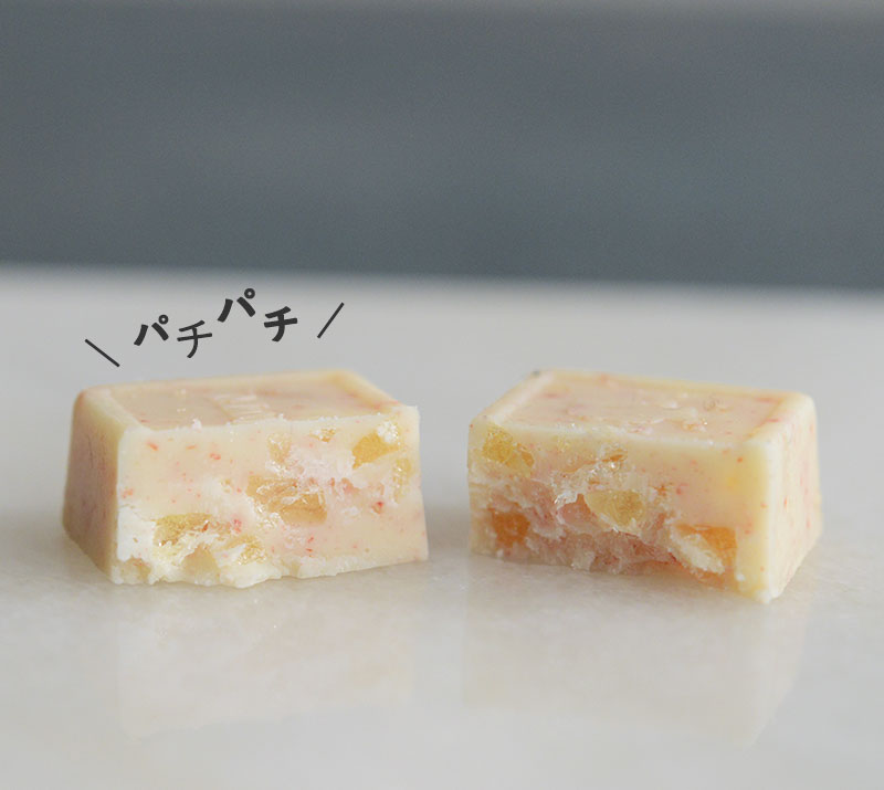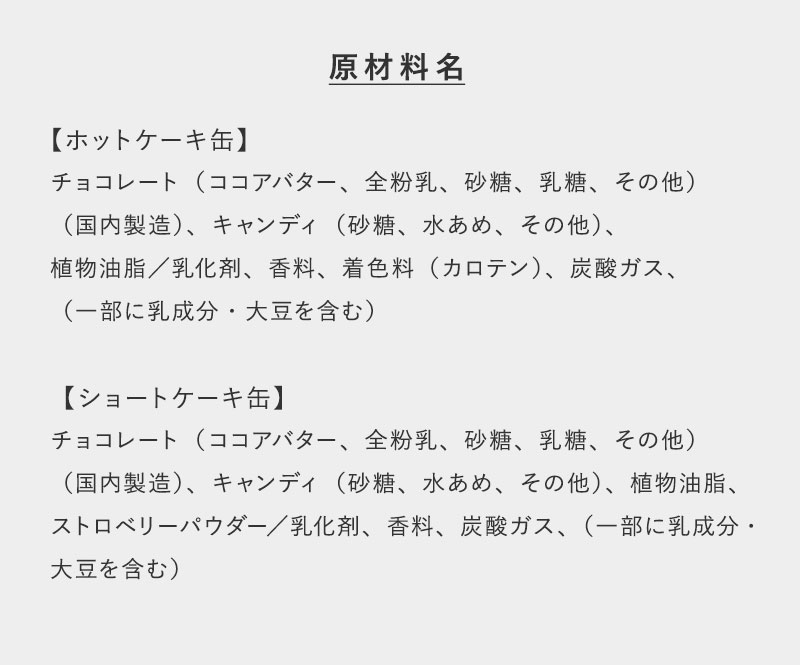 原材料名:チョコレート(ココアバター、全粉乳、砂糖、乳糖、その他)(国内製造)、キャンディ(砂糖、水あめ、その他)、植物油脂、ストロベリーパウダー/乳化剤、香料、着色料(カロテン)、炭酸ガス、(一部に乳成分・大豆を含む)