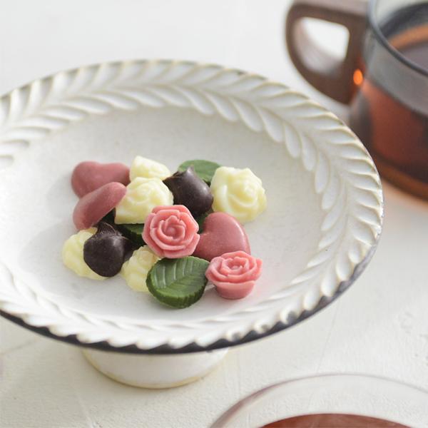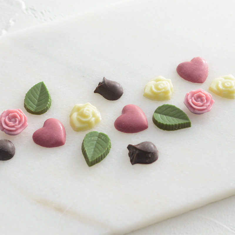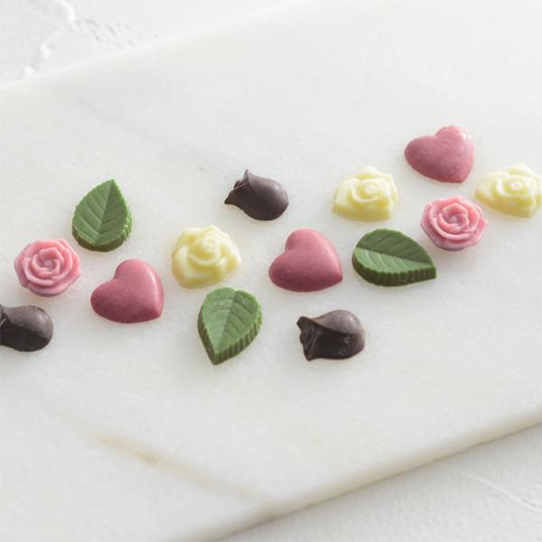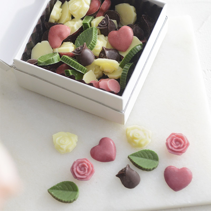 - シーズンごとに彩りやモチーフが変わるショコラギフトボックス。ピンクや白のバラ、ハート型などバレンタインならではの華やかなチョコレートが詰められています。