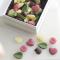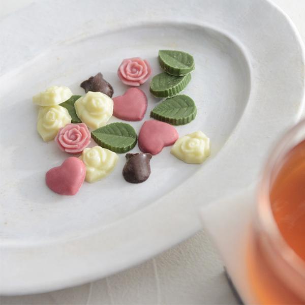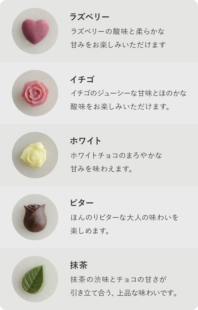 原材料名:チョコレート(砂糖、ココアバター、植物油脂、カカオマス、脱脂粉乳、全粉乳、乳糖)(国内製造)、いちごパウダー、ココアバター、抹茶、ココアパウダー、ラズベリーパウダー/乳化剤、香料、酸化防止剤(V.C)、着色料( アカビート)、(一部に乳成分・大豆を含む)