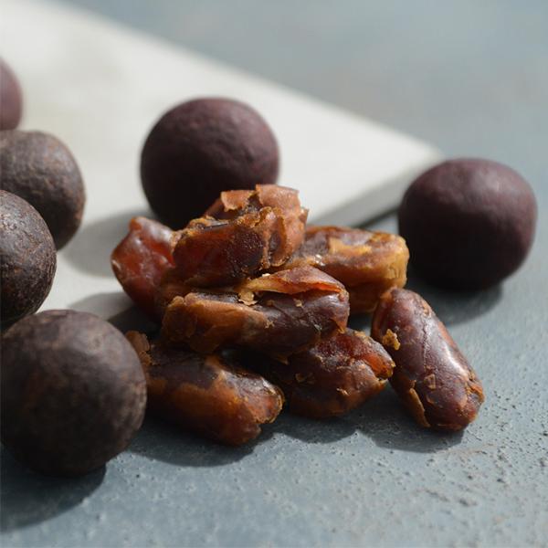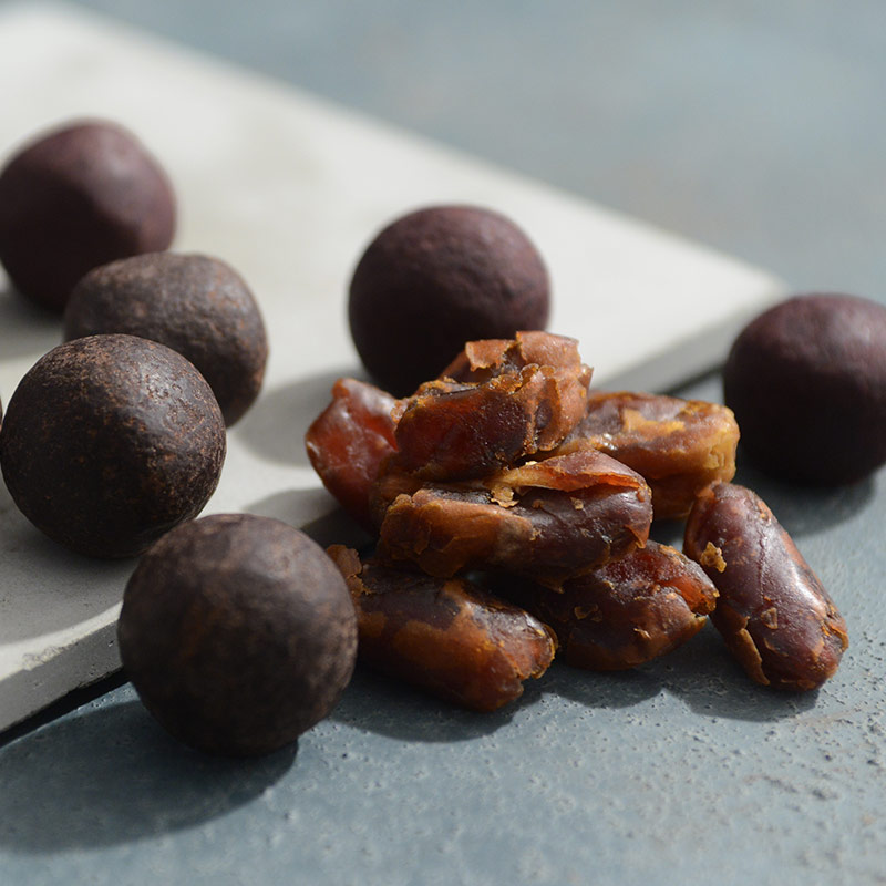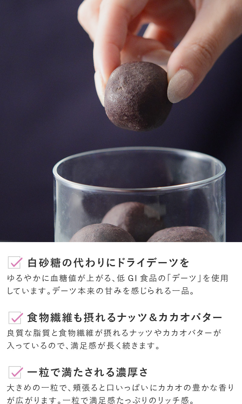 ベリーダークチョコ/デーツ、チョコレート、ひまわりの種、ココアパウダー、ココナッツオイル、ココナッツ、かぼちゃの種、ボイセンベリーパウダー、食塩/香料、乳化剤