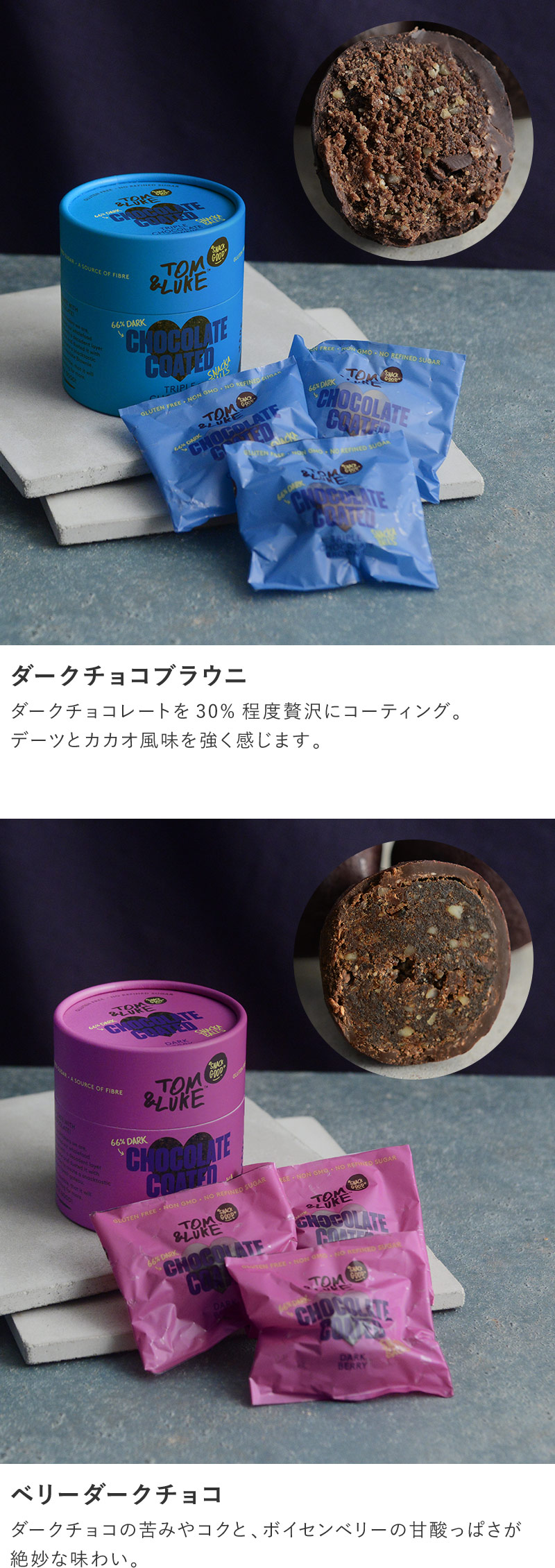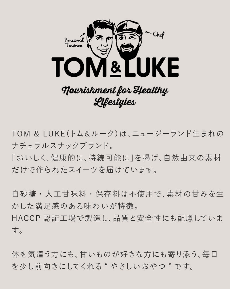 - TOM&LUKEの冬季限定ヘルシーチョコ。精製された白砂糖は使わず、デーツやナッツの自然な甘みを活かしたナチュラルスイーツです。人工香料や保存料も不使用という優しさも。