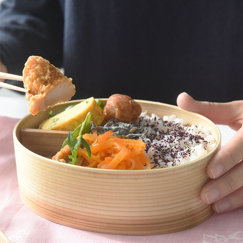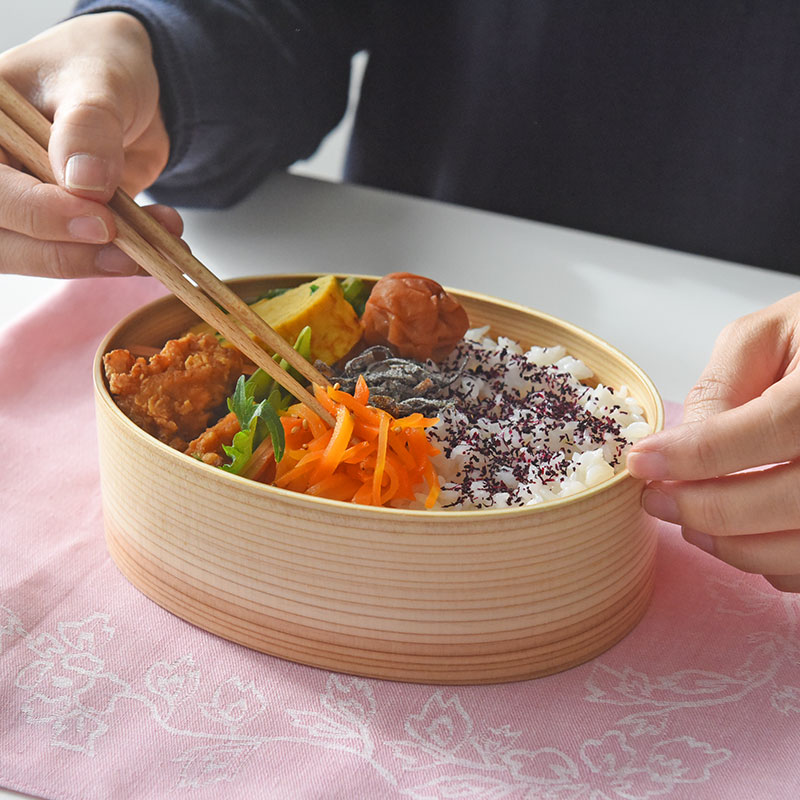 素朴ながらも木目の美しく、どんなおかずも美味しそうに見せてくれる曲げわっぱ。手にすると木の香りがふわっと漂い、食事の時間を穏やかに演出してくれます。