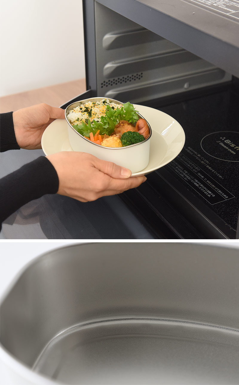 フタを外して電子レンジ500Wで10分以内の加熱が可能。ステンレス素材の美しさと機能性はそのままに、電子レンジで温められる機能も兼ね備えた、新感覚のランチボックスです。