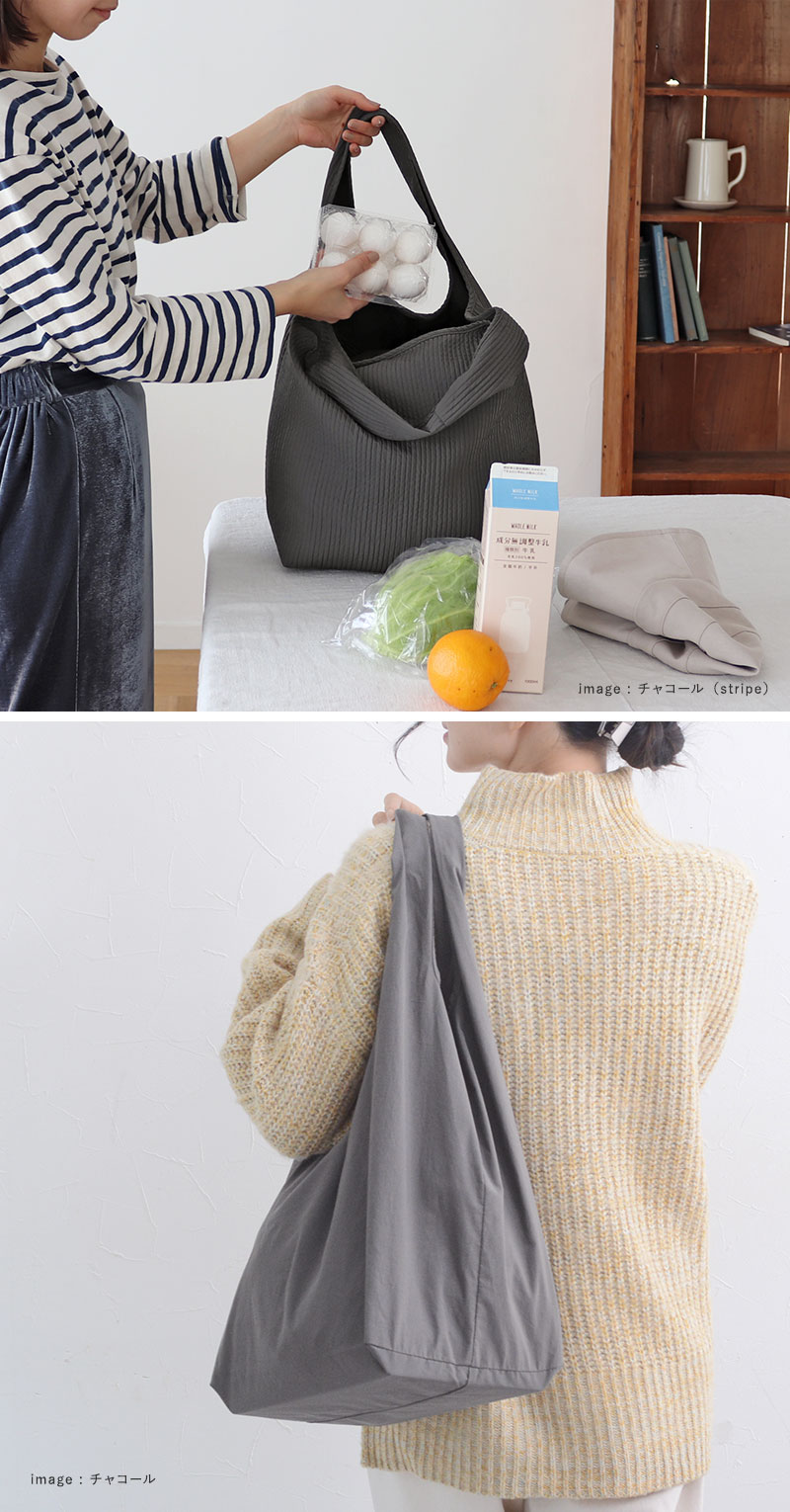 肩掛けしやすいカタチたくさん買い物をしても肩掛けしやすいように、腕を通す部分は広くて丸いカタチに。コートなどで厚着していても腕を通しやすい設計です。
