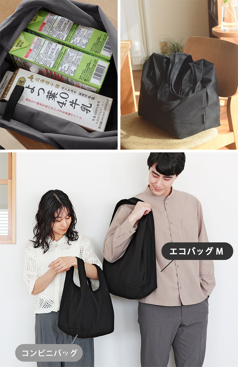 たっぷり買う日は、サイズ違いで2つ使いこちらのシリーズは全3サイズ展開。買い物の量が多い日は、こちらのコンビニバッグと合わせてワンサイズ大きい「エコバッグM」を使えば、ちょうどよく収まります。