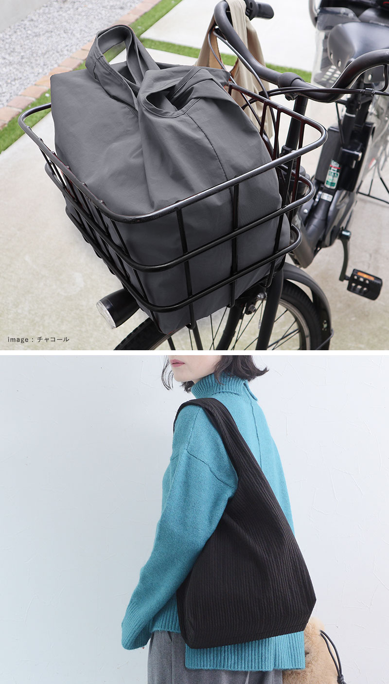 自転車のカゴにスッポリ入るサイズ感なのも嬉しい特徴。ありそうでなかった、理想のカタチのエコバッグです。
