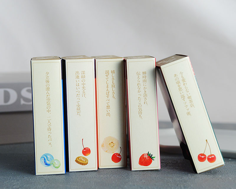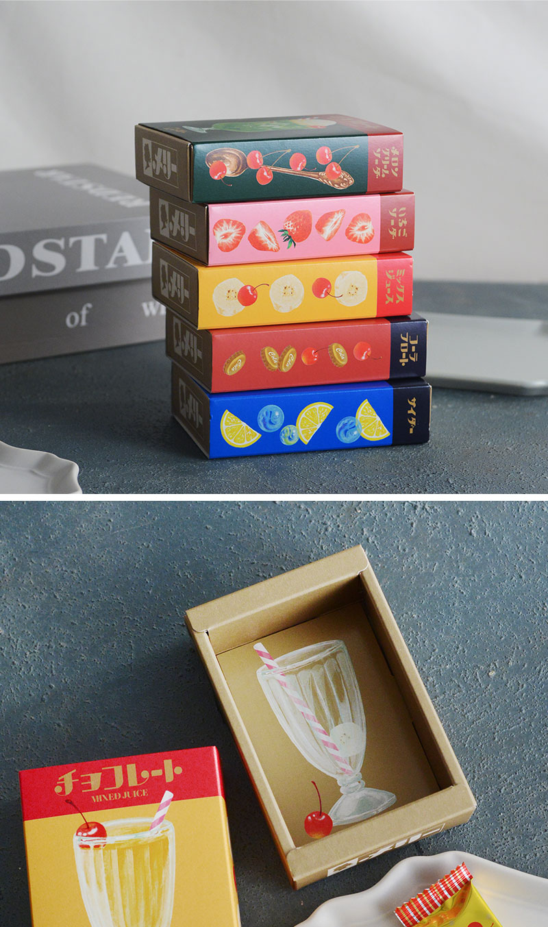 レトロ文具を手掛ける古川紙工とのコラボパッケージ。表面には、純喫茶で見かけるような定番のドリンクがずらりと並びます。マッチ箱を連想させるスライド方式の箱とイラストが相まって、どこか懐かしさを感じます。