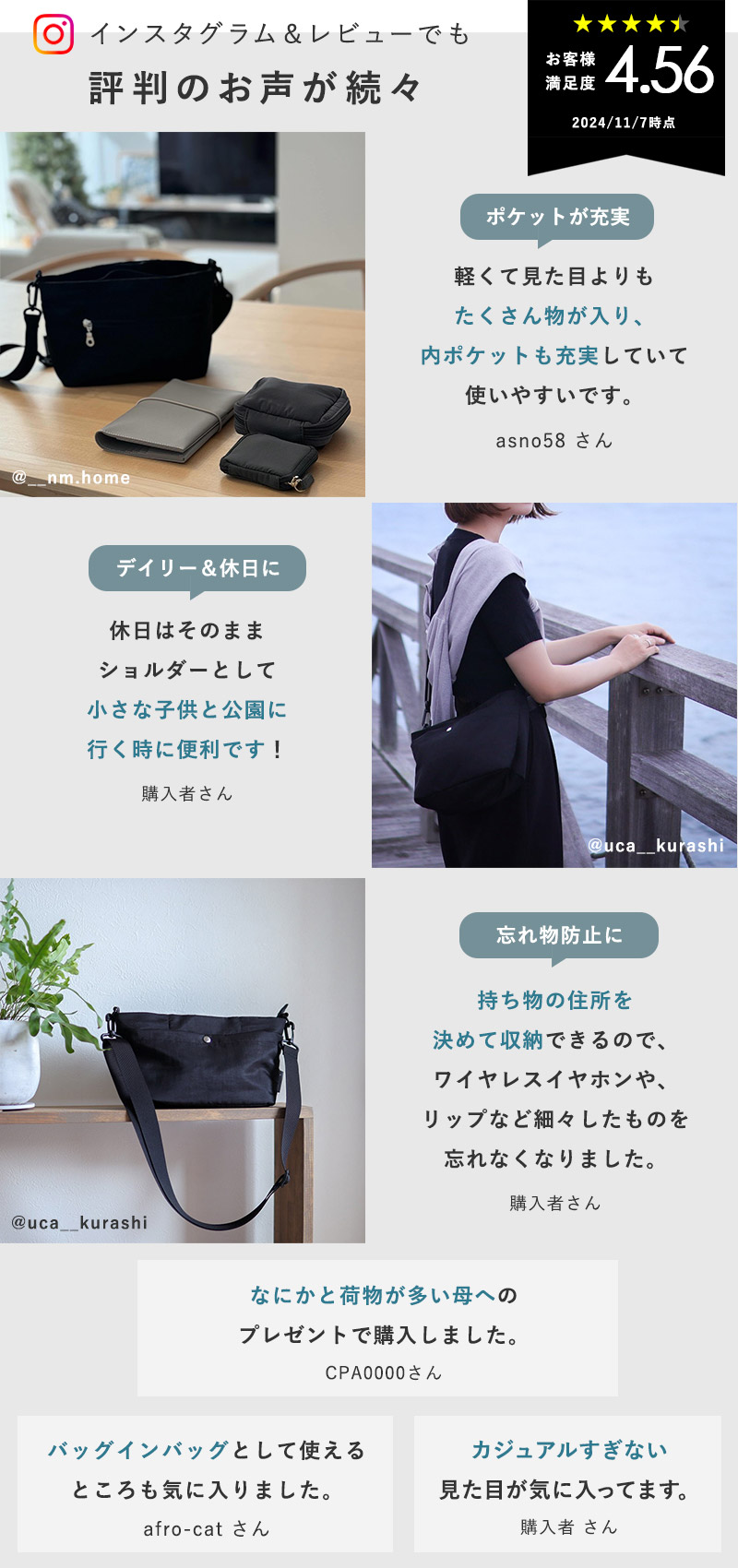 街をぷらっと散歩する時や、近所へのちょっとお買い物。子供と一緒の公園バッグや、犬の散歩時など様々なシーンでお使いいただけます。また、バッグインバッグとしても使えるのでデイリーにも使えます。