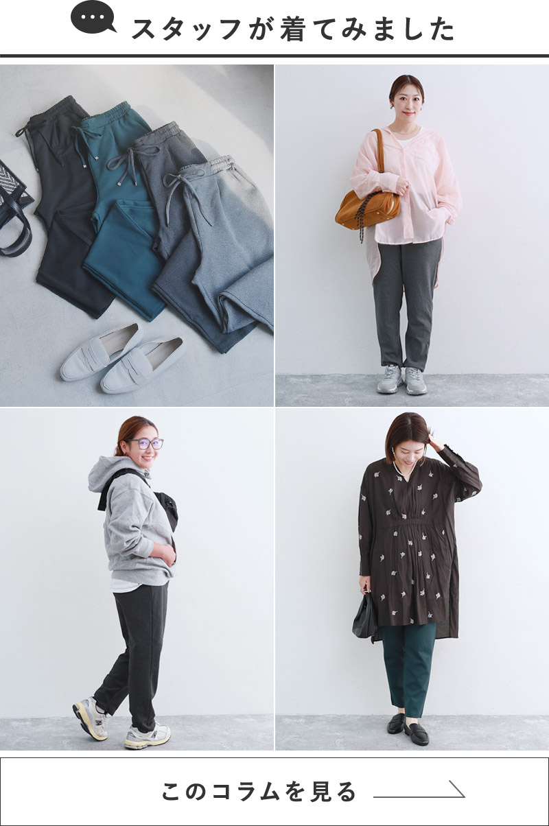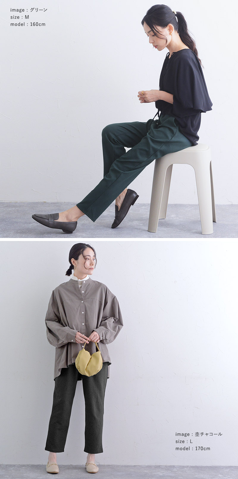 縦のラインをしっかり強調し、裾に向かって細くなるテーパードシルエット。腰回りゆったりで締め付け感もなくリラックス気分で着られます。縦ラインが強調されることで美脚見えも。