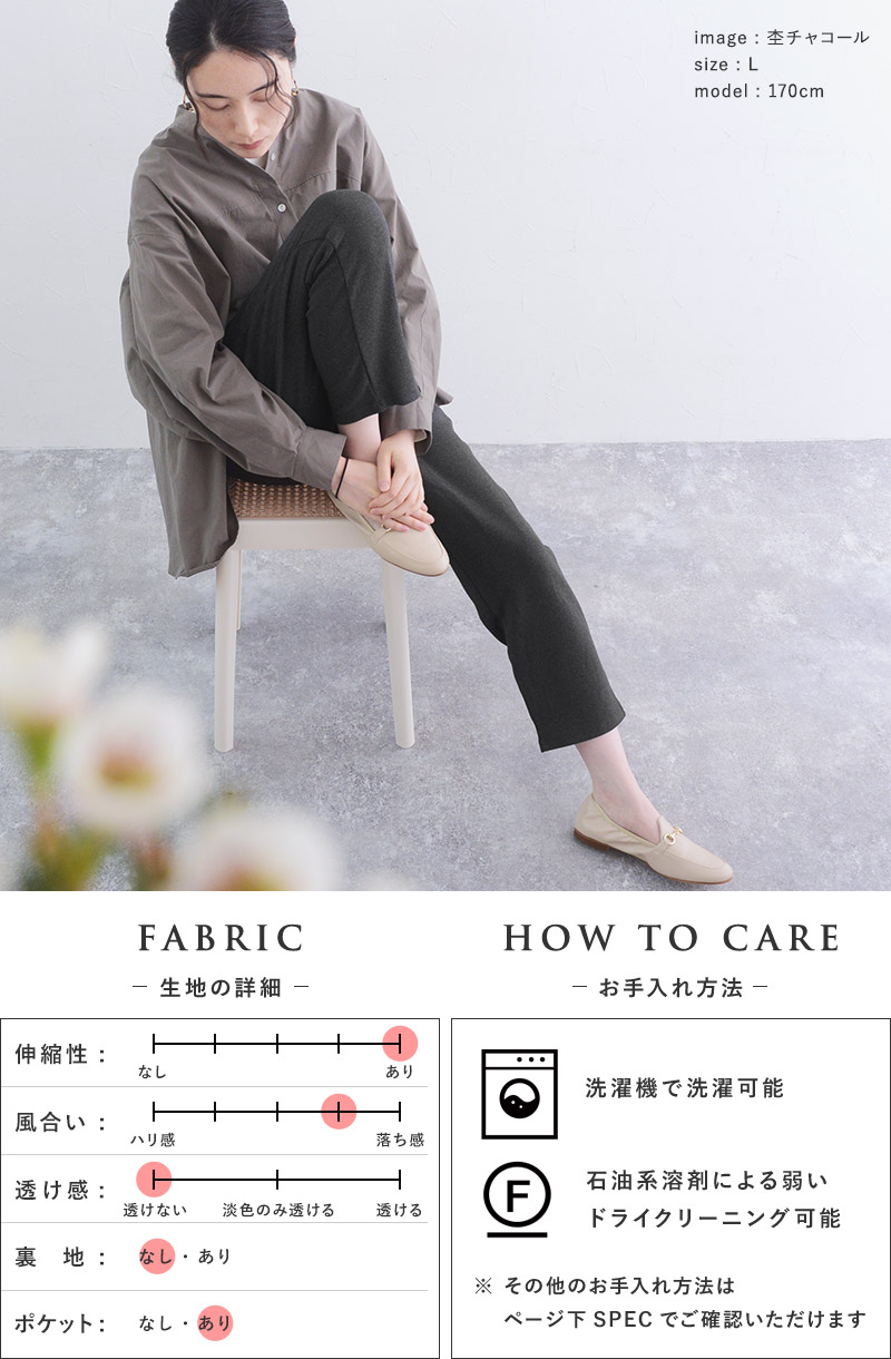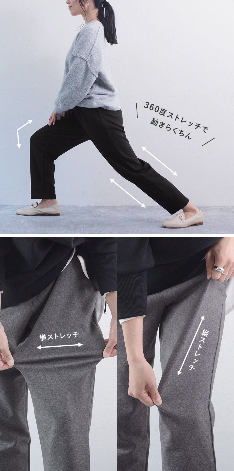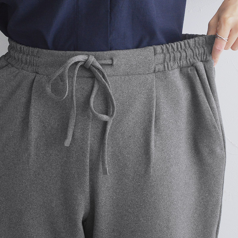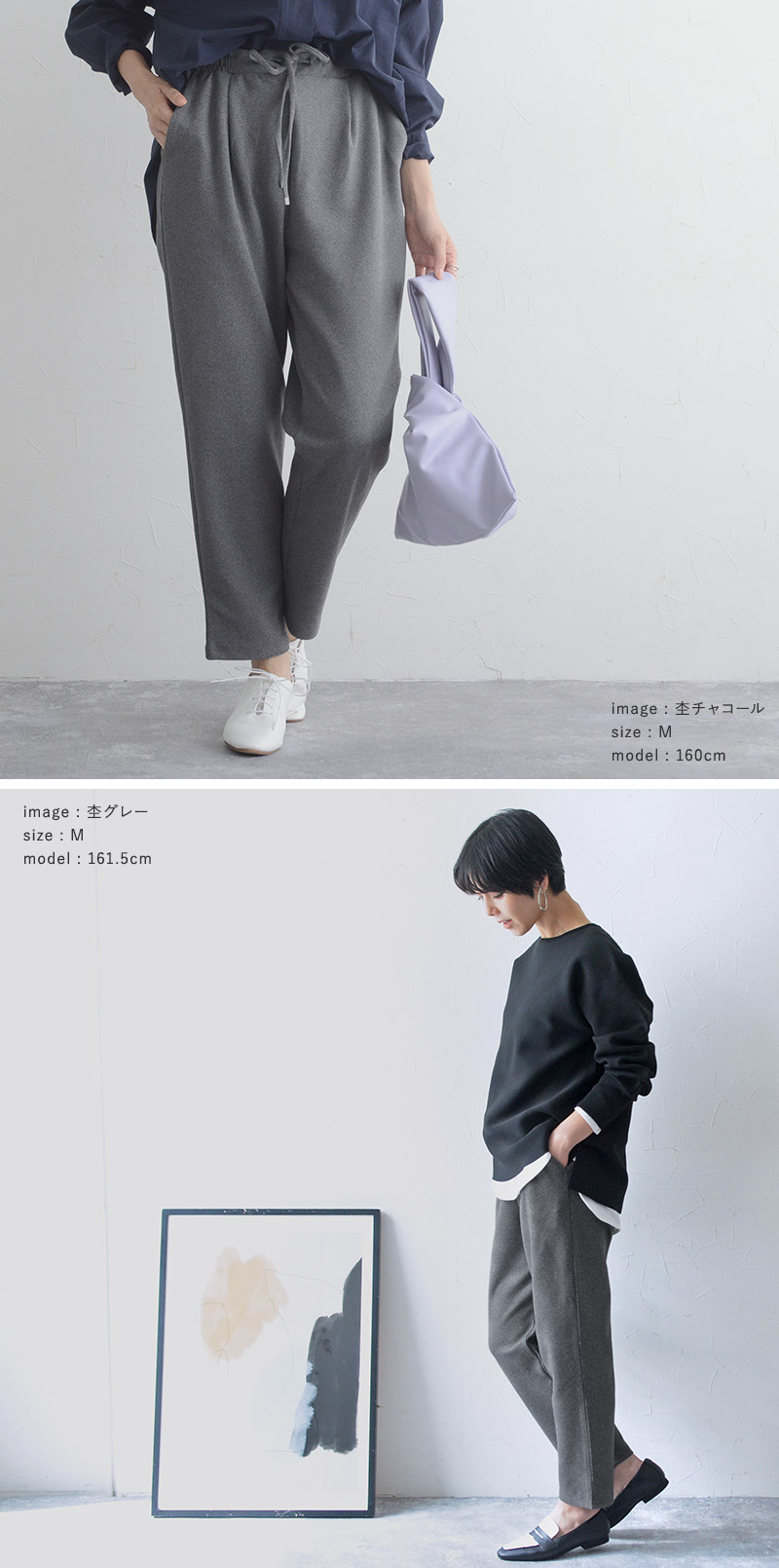 まるでルームウェアのような穿き心地ながら、着てみるとすらっと美しいシルエット。