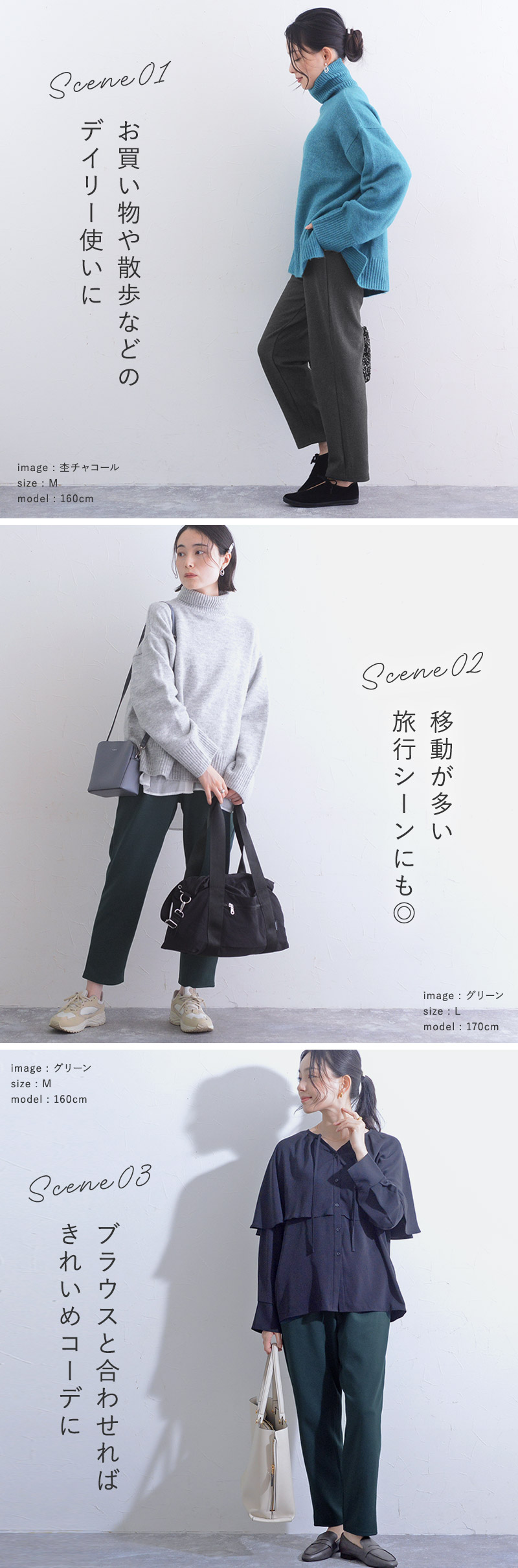 様々なシーンやテイストにもはまる、名バランサー。ワンマイルのお出かけにも、旅行にも、背筋が伸びる1日にも選びたくなるパンツです。